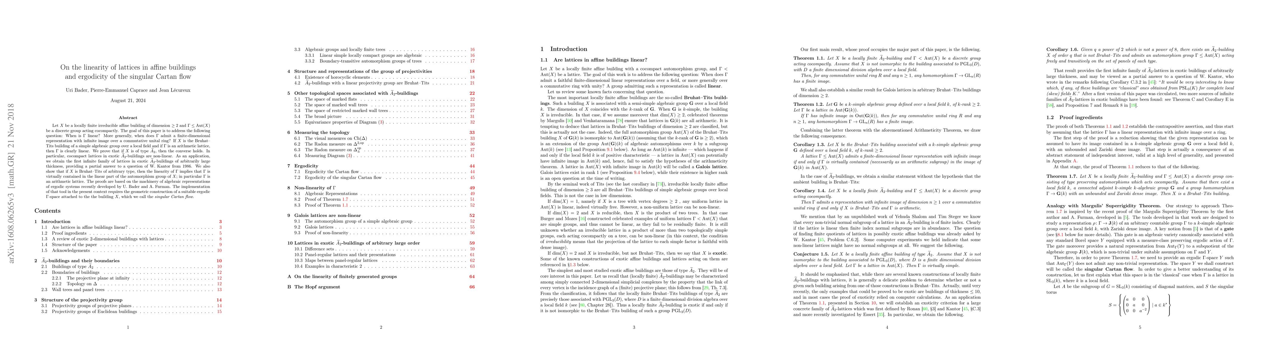 Let $X$ be a locally finite irreducible affine building of dimension $\geq 2$ and $\Gamma \leq \mathrm{Aut}(X)$ be a discrete group acting cocompactly. The goal of this paper is to address the following question: When is $\Gamma$ linear? More generally, when does $\Gamma$ admit a finite-dimensional representation with infinite image over a commutative unital ring? If $X$ is the Bruhat--Tits building of a simple algebraic group over a local field and if $\Gamma$ is an arithmetic lattice, then $\Gamma$ is clearly linear. We prove that if $X$ is of type $\widetilde A_2$, then the converse holds. In particular, cocompact lattices in exotic $\widetilde A_2$-buildings are non-linear. As an application, we obtain the first infinite family of lattices in exotic $\widetilde A_2$-buildings of arbitrarily large thickness, providing also a partial answer to a question of W. Kantor from 1986. We also show that if $X$ is Bruhat--Tits of arbitrary type, then the linearity of $\Gamma$ implies that $\Gamma$ is virtually contained in the linear part of the automorphism group of $X$, in particular $\Gamma$ is an arithmetic lattice. The proofs are based on the machinery of algebraic representations of ergodic systems recently developed by U. Bader and A. Furman. The implementation of that tool in the present context requires the geometric construction of a suitable ergodic $\Gamma$-space attached to the the building $X$, which we call the \emph{singular Cartan flow}.