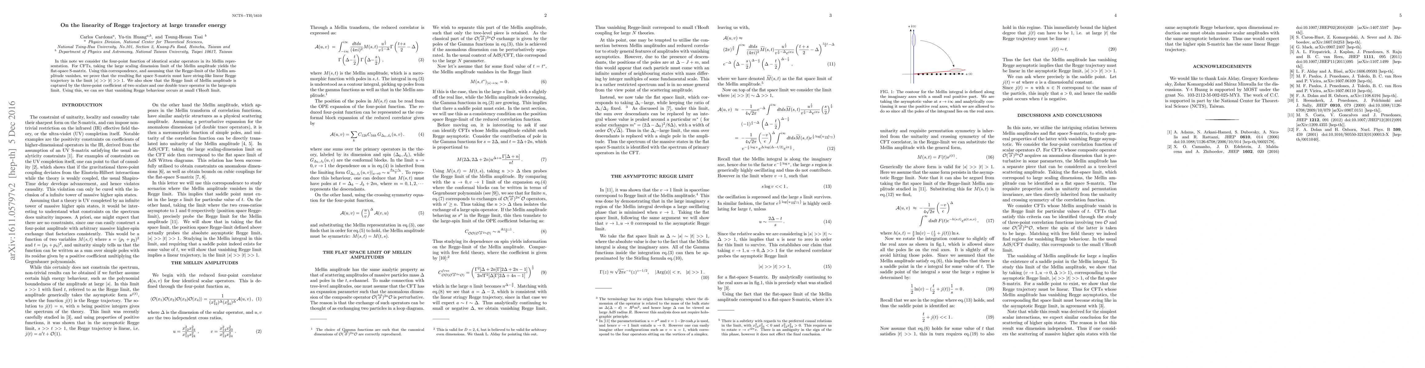 In this note we consider the four-point function of identical scalar operators in its Mellin representation. For CFTs, taking the large scaling dimension limit of the Mellin amplitude yields the flat-space S-matrix. Using this correspondence, and assuming that the Regge-limit of the Mellin amplitude vanishes, we prove that the resulting flat space S-matrix must have string-like linear Regge trajectory in the limit |s|>>|t|>>1. We also show that the Regge limit of Mellin amplitude is captured by the three-point coefficient of two scalars and one double trace operator in the large-spin limit. Using this, we can see that vanishing Regge behaviour occurs at small t'Hooft limit.