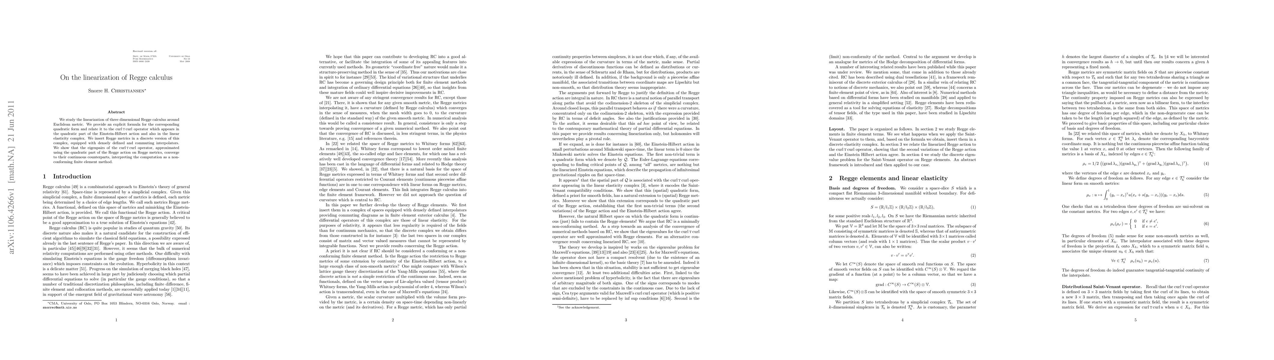 We study the linearization of three dimensional Regge calculus around Euclidean metric. We provide an explicit formula for the corresponding quadratic form and relate it to the curlTcurl operator which appears in the quadratic part of the Einstein-Hilbert action and also in the linear elasticity complex. We insert Regge metrics in a discrete version of this complex, equipped with densely defined and commuting interpolators. We show that the eigenpairs of the curlTcurl operator, approximated using the quadratic part of the Regge action on Regge metrics, converge to their continuous counterparts, interpreting the computation as a non-conforming finite element method.