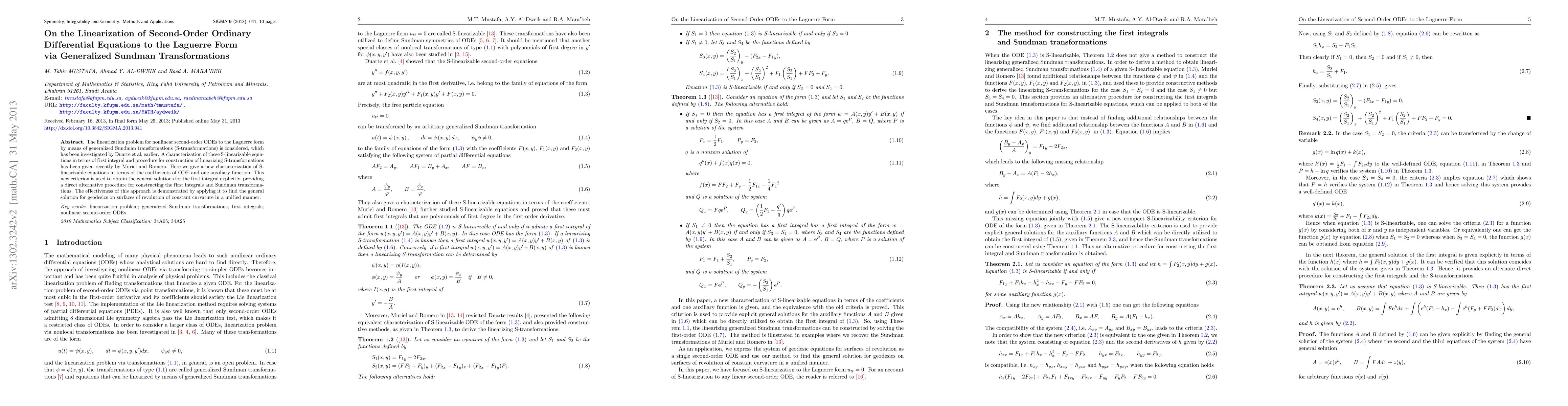 This paper proposes a new characterization of second-order ODEs that can be linearized into the Laguerre form using generalized Sundman transformations. It provides a direct method for constructing the first integrals and transformations, demonstrated through finding the general solution for geodesics on surfaces of revolution.