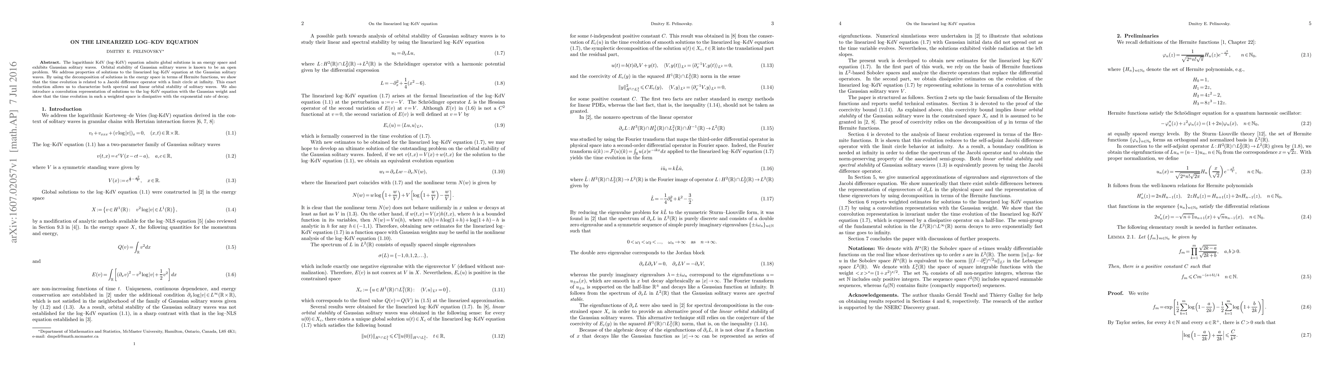 This paper investigates the linearized log-KdV equation at Gaussian solitary waves, demonstrating spectral and linear orbital stability through a reduction to a Jacobi difference operator. It also presents a convolution representation showing exponential decay in a weighted space.