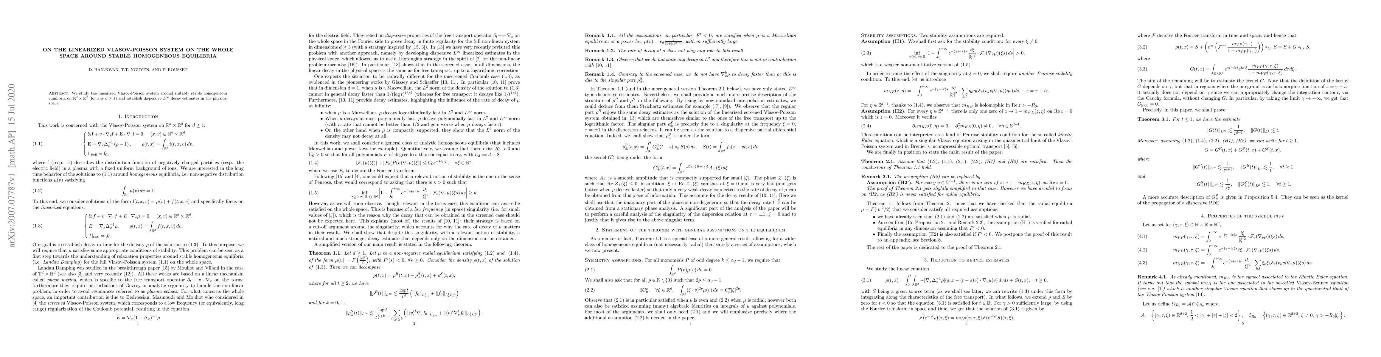 We study the linearized Vlasov-Poisson system around suitably stable homogeneous equilibria on $\mathbb{R}^d\times \mathbb{R}^d$ (for any $d \geq 1$) and establish dispersive $L^\infty$ decay estimates in the physical space.