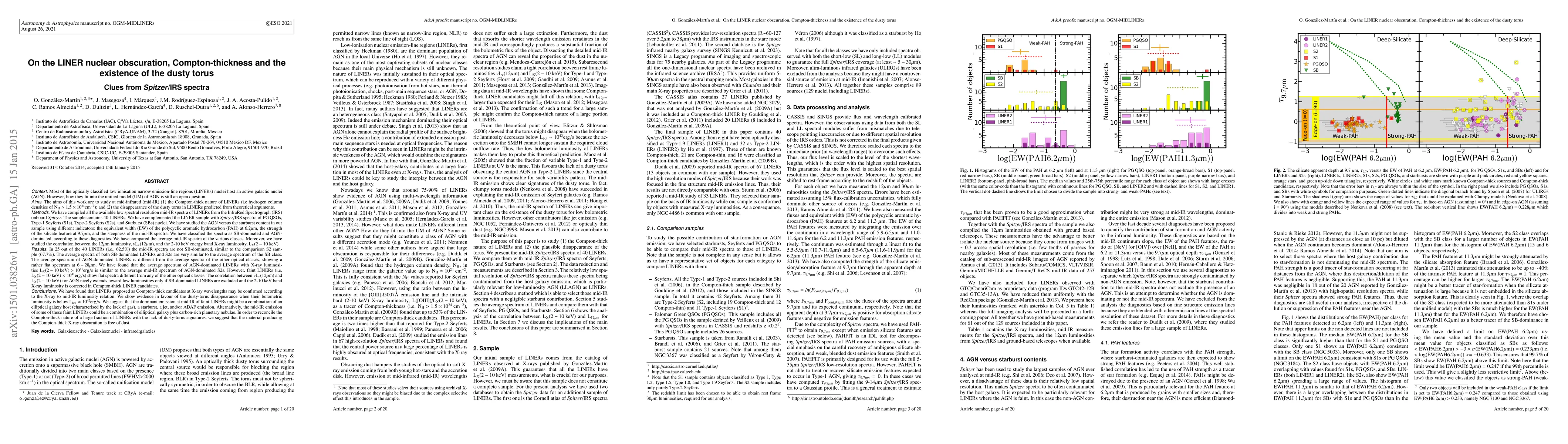 Most of the optically classified low ionisation narrow emission-line regions (LINERs) nuclei host an active galactic nuclei (AGN). However, how they fit into the unified model (UM) of AGN is still an open question. The aims of this work are to study at mid-infrared (mid-IR) (1) the Compton-thick nature of LINERs; and (2) the disappearance of the dusty torus in LINERs predicted from theoretical arguments. We have compiled all the available low spectral resolution mid-IR spectra of LINERs from the IRS/Spitzer (40 LINERs). We have complemented this sample with Spitzer/IRS spectra of PGQSOs, S1s, S2s, and SBs nuclei. We have studied the AGN versus the starburst content in our sample using different indicators: the EW(PAH 6.2um), the strength of the silicate feature at 9.7um, and the steepness of the mid-IR spectra. In 25 out of the 40 LINERs (i.e., 62.5%) the mid-IR spectra are not SB-dominated, similar to the comparison S2 sample (67.7%). The average spectra of both SB-dominated LINERs and S2s are very similar to the average spectrum of the SB class. Moreover, the average spectrum of AGN-dominated LINERs with Lx(2-10keV)>10E+41 erg/s is similar to the average mid-IR spectrum of AGN-dominated S2s. However, faint LINERs show flat spectra different from any of the other optical classes, suggesting the disappearance of the dusty torus. The correlation between nuLnu(12um) and Lx(2-10keV) for AGN nicely extends toward low luminosities only if SB-dominated LINERs are excluded and Lx(2-10keV) is corrected in Compton-thick LINER candidates. We discuss the nature of faint LINERs by comparing it with the spectra of several emission mechanisms like jet, ADAF, planetary nebulae, or post-AGB stars. We suggest that the material producing the Compton-thick X-ray obscuration is free of dust, to reconcile the Compton-thick nature of a large fraction of LINERs with the lack of dusty-torus signatures.