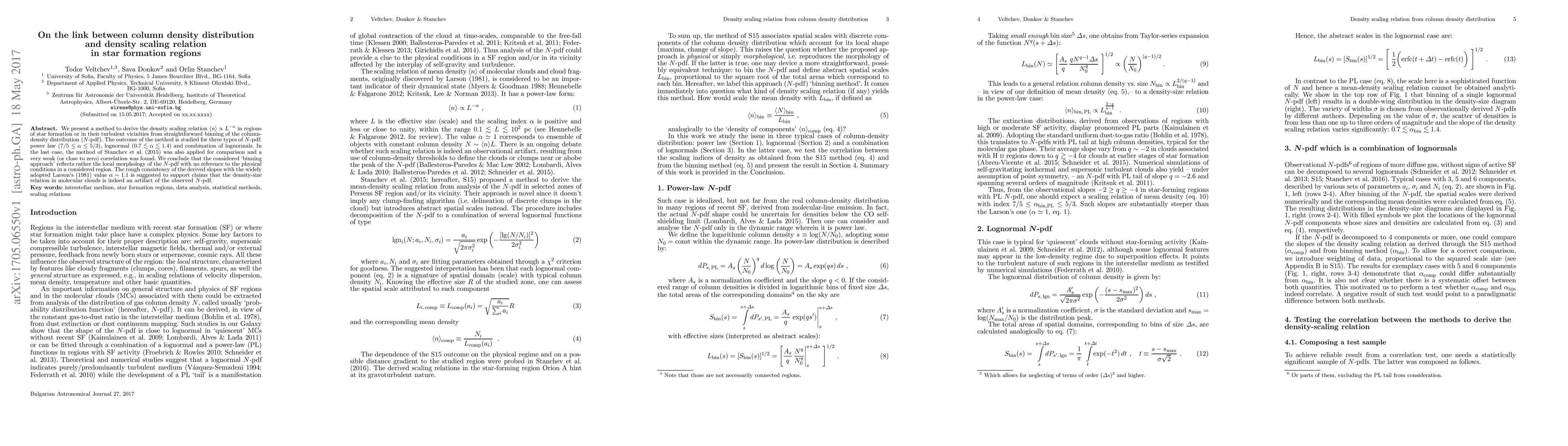 We present a method to derive the density scaling relation $\langle n\rangle \propto L^{-\alpha}$ in regions of star formation or in their turbulent vicinities from straightforward binning of the column-density distribution ($N$-pdf). The outcome of the method is studied for three types of $N$-pdf: power law ($7/5\le\alpha\le5/3$), lognormal ($0.7\lesssim\alpha\lesssim1.4$) and combination of lognormals. In the last case, the method of Stanchev et al. (2015) was also applied for comparison and a very weak (or close to zero) correlation was found. We conclude that the considered `binning approach' reflects rather the local morphology of the $N$-pdf with no reference to the physical conditions in a considered region. The rough consistency of the derived slopes with the widely adopted Larson's (1981) value $\alpha\sim1.1$ is suggested to support claims that the density-size relation in molecular clouds is indeed an artifact of the observed $N$-pdf.