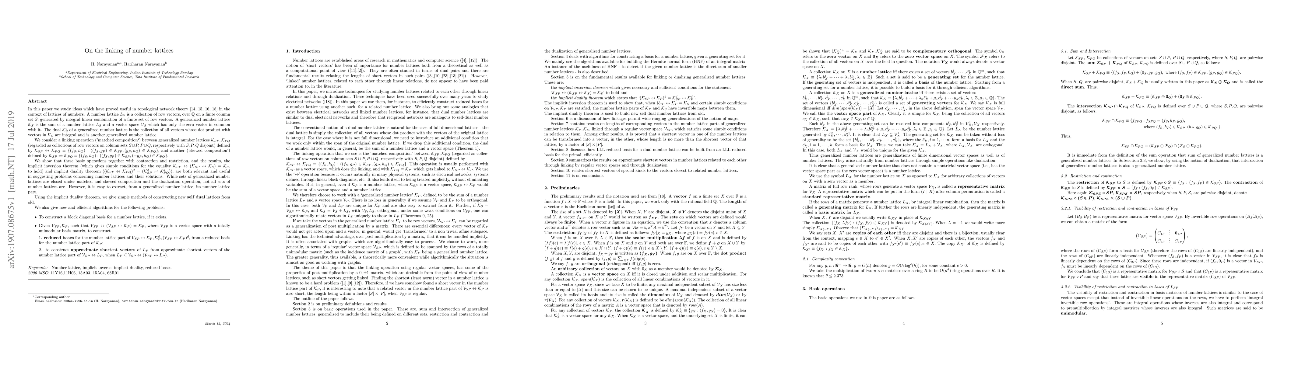 In this paper we study ideas which have proved useful in topological network theory in the context of lattices of numbers. A number lattice $L_S$ is a collection of row vectors, over $\mathbb{Q}$ on a finite column set $S,$ generated by integral linear combination of a finite set of row vectors. A generalized number lattice $K_S$ is the sum of a number lattice $L_S$ and a vector space $V_S$ which has only the zero vector in common with it. The dual $K^d_S$ of a generalized number lattice is the collection of all vectors whose dot product with vectors in $K_S$ are integral and is another generalized number lattice. We consider a linking operation ('matched composition`) between generalized number lattices $K_{SP},K_{P}$ (regarded as collections of row vectors on column sets $S\cup P, P,$ respectively with $S,P,$ disjoint) defined by $K_{SP}\leftrightarrow K_{P}\equiv \{f_S:((f_S,g_P)\in K_{SP}, g_P \in K_{P}\}.$ We show that this operation together with contraction and restriction, and the results, the implicit inversion theorem (which gives simple conditions for the equality $K_{SP}\leftrightarrow (K_{SP}\leftrightarrow K_S)= K_S,$ to hold) and implicit duality theorem ($(K_{SP}\leftrightarrow K_{P})^d= K_{SP}^d\leftrightarrow K_{P}^d$)), are both relevant and useful in suggesting problems concerning number lattices and their solutions. Using the implicit duality theorem, we give simple methods of constructing new self dual lattices from old. We also give new and efficient algorithms for the following. Given $V_{SP},K_P,$ such that $V_{SP}\leftrightarrow (V_{SP}\leftrightarrow K_P)= K_P,$ where $V_{SP}$ is a vector space with a totally unimodular basis matrix, to construct reduced bases for the number lattice part of $V_{SP}\leftrightarrow K_P, K_P^d, (V_{SP}\leftrightarrow K_P)^d,$ from a reduced basis for the number lattice part of $K_P.$