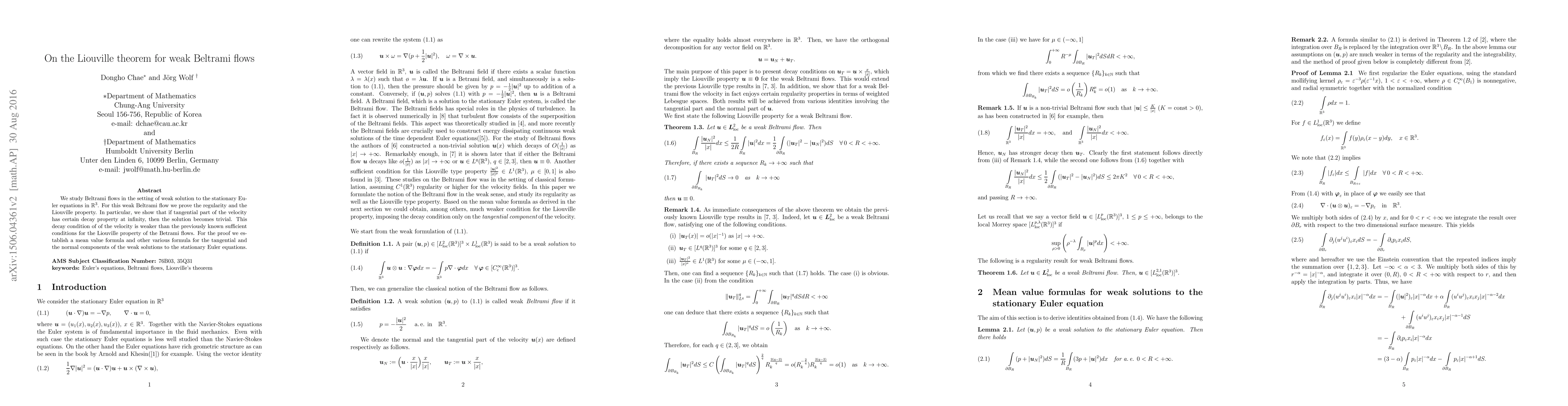 We study Beltrami flows in the setting of weak solution to the stationary Euler equations in $\Bbb R^3$. For this weak Beltrami flow we prove the regularity and the Liouville property. In particular, we show that if tangential part of the velocity has certain decay property at infinity, then the solution becomes trivial. This decay condition of of the velocity is weaker than the previously known sufficient conditions for the Liouville property of the Betrami flows. For the proof we establish a mean value formula and other various formula for the tangential and the normal components of the weak solutions to the stationary Euler equations.