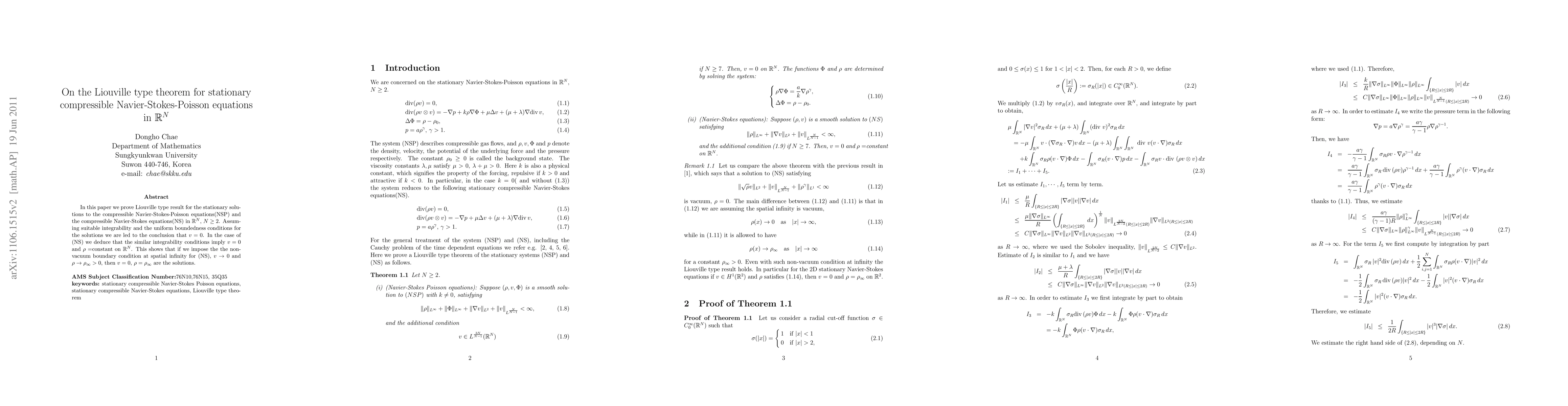 In this paper we prove Liouville type result for the stationary solutions to the compressible Navier-Stokes-Poisson equations(NSP) and the compressible Navier-Stokes equations(NS) in $\Bbb R^N$, $N\geq 2$. Assuming suitable integrability and the uniform boundedness conditions for the solutions we are led to the conclusion that $v=0$. In the case of (NS) we deduce that the similar integrability conditions imply $v=0$ and $\rho=$constant on $\Bbb R^N$. This shows that if we impose the the non-vacuum boundary condition at spatial infinity for (NS), $v\to 0$ and $\rho\to \rho_\infty >0$, then $v=0$, $\rho=\rho_\infty$ are the solutions.