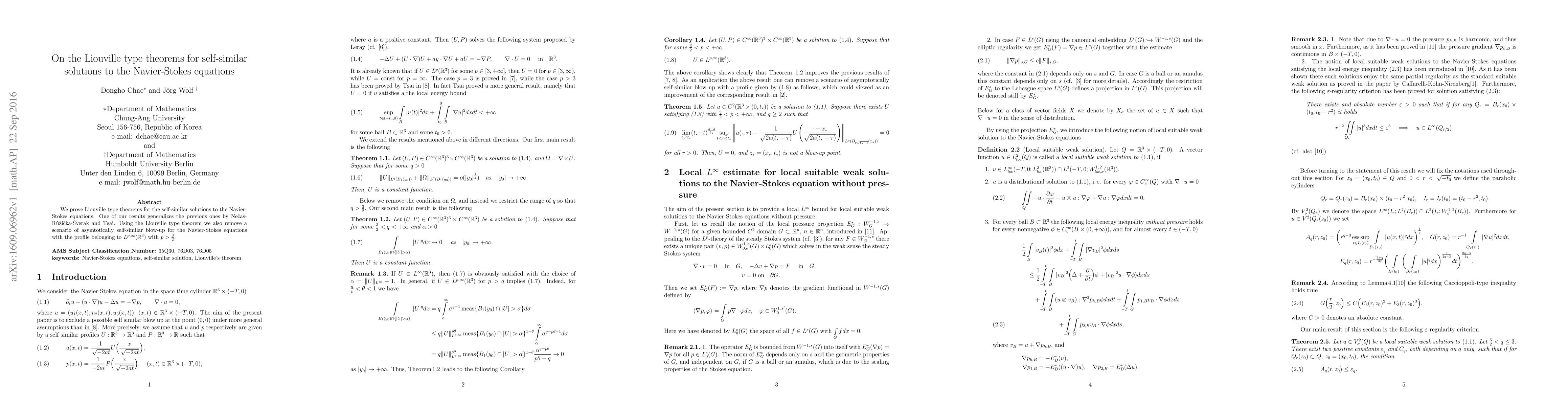 This paper proves Liouville type theorems for self-similar solutions to the Navier-Stokes equations, generalizing previous results and eliminating the possibility of asymptotically self-similar blow-up for profiles in $L^{p, \infty} (\Bbb R^3)$ with $p> \frac{3}{2}$.