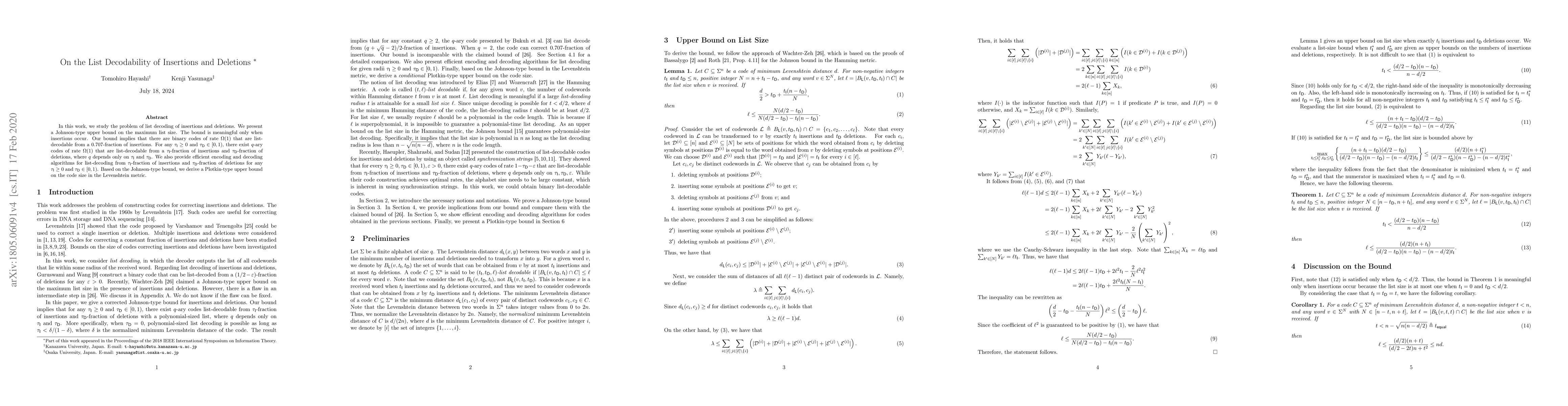 In this work, we study the problem of list decoding of insertions and deletions. We present a Johnson-type upper bound on the maximum list size. The bound is meaningful only when insertions occur. Our bound implies that there are binary codes of rate $\Omega(1)$ that are list-decodable from a $0.707$-fraction of insertions. For any $\tau_\mathsf{I} \geq 0$ and $\tau_\mathsf{D} \in [0,1)$, there exist $q$-ary codes of rate $\Omega(1)$ that are list-decodable from a $\tau_\mathsf{I}$-fraction of insertions and $\tau_\mathsf{D}$-fraction of deletions, where $q$ depends only on $\tau_\mathsf{I}$ and $\tau_\mathsf{D}$. We also provide efficient encoding and decoding algorithms for list-decoding from $\tau_\mathsf{I}$-fraction of insertions and $\tau_\mathsf{D}$-fraction of deletions for any $\tau_\mathsf{I} \geq 0$ and $\tau_\mathsf{D} \in [0,1)$. Based on the Johnson-type bound, we derive a Plotkin-type upper bound on the code size in the Levenshtein metric.