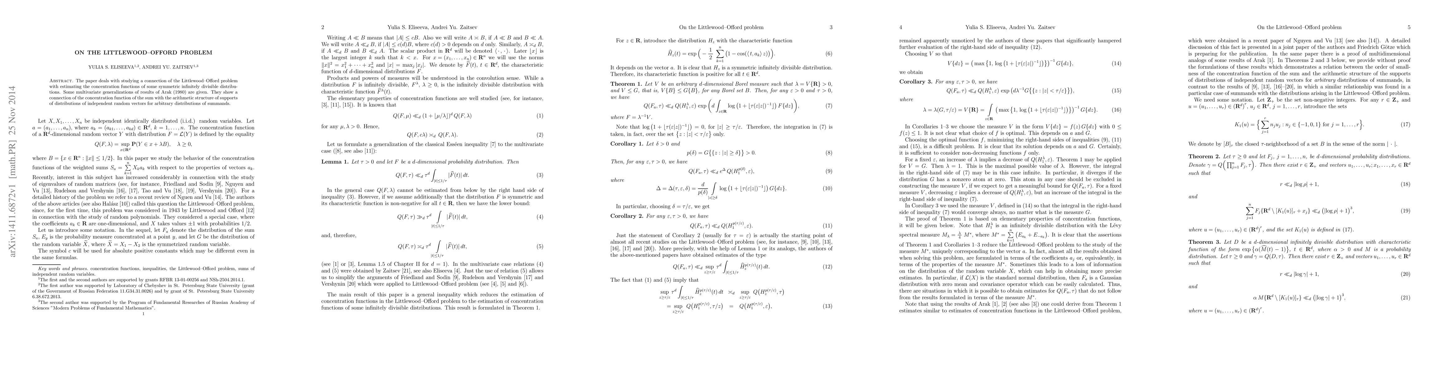 The paper explores a connection between the Littlewood-Offord problem and concentration functions of symmetric infinitely divisible distributions, revealing a link between the sum's concentration function and the arithmetic structure of independent random vector supports.
