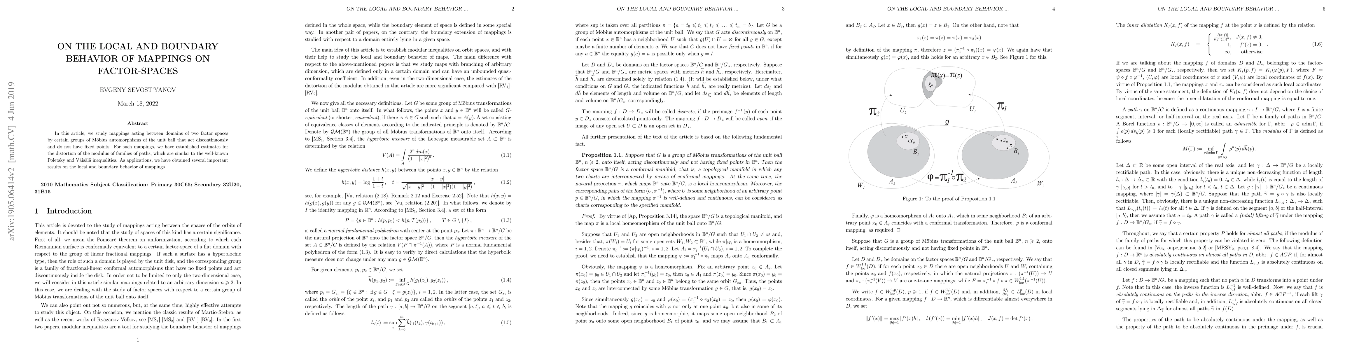 In this article, we study mappings acting between domains of two factor spaces by certain groups of M\"{o}bius automorphisms of the unit ball that act discontinuously and do not have fixed points. For such mappings, we have established estimates for the distortion of the modulus of families of paths, which are similar to the well-known Poletsky and V\"{a}is\"{a}l\"{a} inequalities. As applications, we have obtained several important results on the local and boundary behavior of mappings.