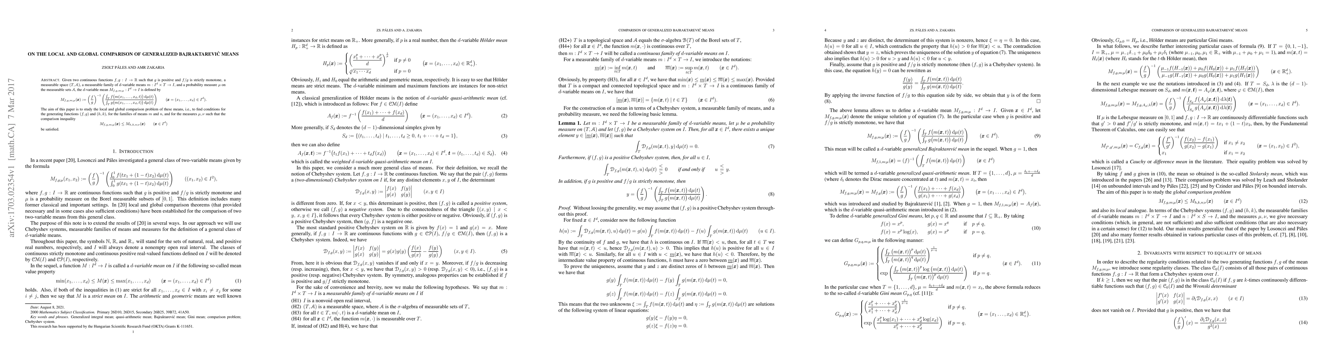 Given two continuous functions $f,g:I\to\mathbb{R}$ such that $g$ is positive and $f/g$ is strictly monotone, a measurable space $(T,A)$, a measurable family of $d$-variable means $m: I^d\times T\to I$, and a probability measure $\mu$ on the measurable sets $A$, the $d$-variable mean $M_{f,g,m;\mu}:I^d\to I$ is defined by $$ M_{f,g,m;\mu}(\pmb{x}) :=\left(\frac{f}{g}\right)^{-1}\left( \frac{\int_T f\big(m(x_1,\dots,x_d,t)\big) d\mu(t)} {\int_T g\big(m(x_1,\dots,x_d,t)\big) d\mu(t)}\right) \qquad(\pmb{x}=(x_1,\dots,x_d)\in I^d). $$ The aim of this paper is to study the local and global comparison problem of these means, i.e., to find conditions for the generating functions $(f,g)$ and $(h,k)$, for the families of means $m$ and $n$, and for the measures $\mu,\nu$ such that the comparison inequality $$ M_{f,g,m;\mu}(\pmb{x})\leq M_{h,k,n;\nu}(\pmb{x}) \qquad(\pmb{x}\in I^d) $$ be satisfied.