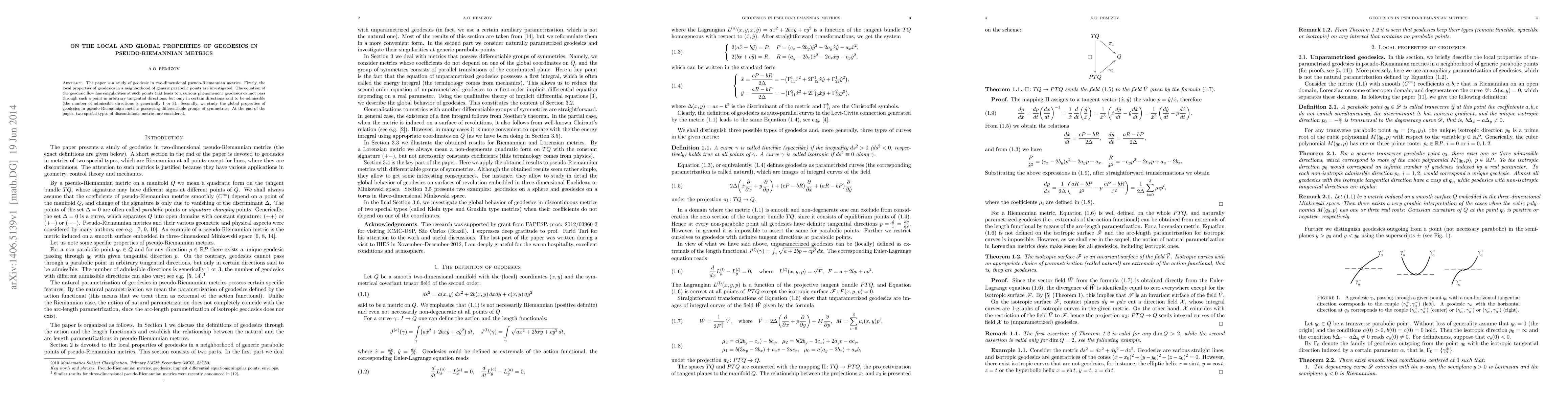 This paper investigates the local and global properties of geodesics in two-dimensional pseudo-Riemannian metrics, focusing on the singularities at parabolic points and the restricted admissible tangential directions. It also examines the global behavior of geodesics in metrics with differentiable symmetry groups and discusses two special types of discontinuous metrics.