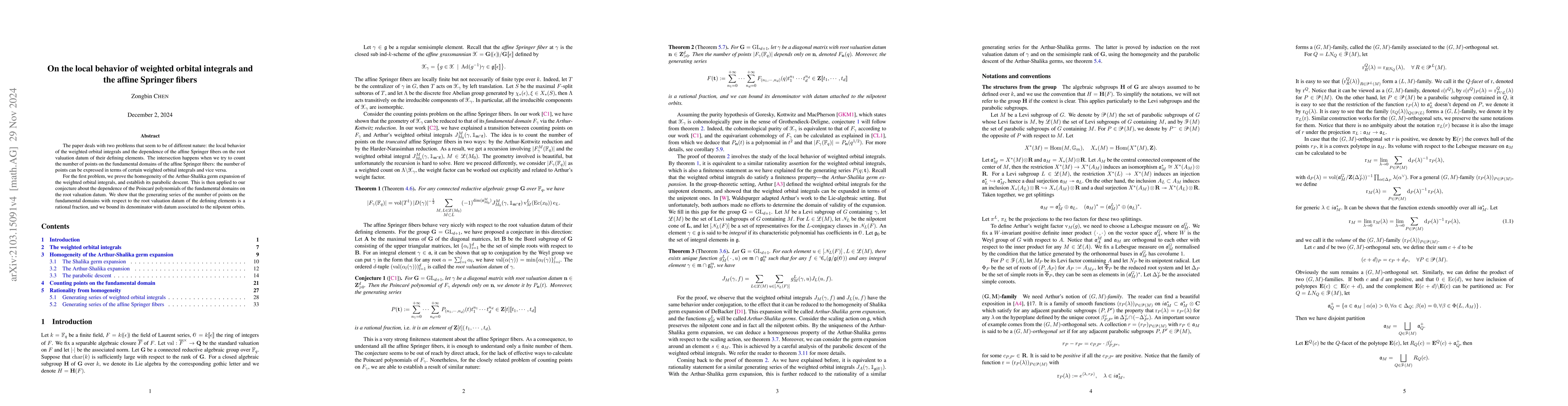 Summary: The paper investigates the local behavior of weighted orbital integrals and the relationship of affine Springer fibers with root valuation data, proving the homogeneity of the Arthur-Shalika expansion and establishing parabolic descent, which helps in proving that the generating series of points on fundamental domains is a rational fraction.