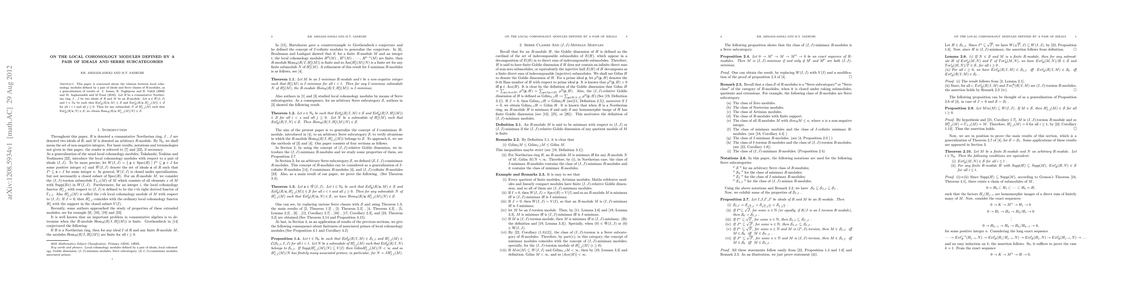 This paper explores the relationship between local cohomology modules defined by a pair of ideals and Serre subcategories of R-modules, extending prior results. It establishes that under certain conditions, HomR(R/a;H^t_I;J(M)/N) belongs to the specified Serre class S.