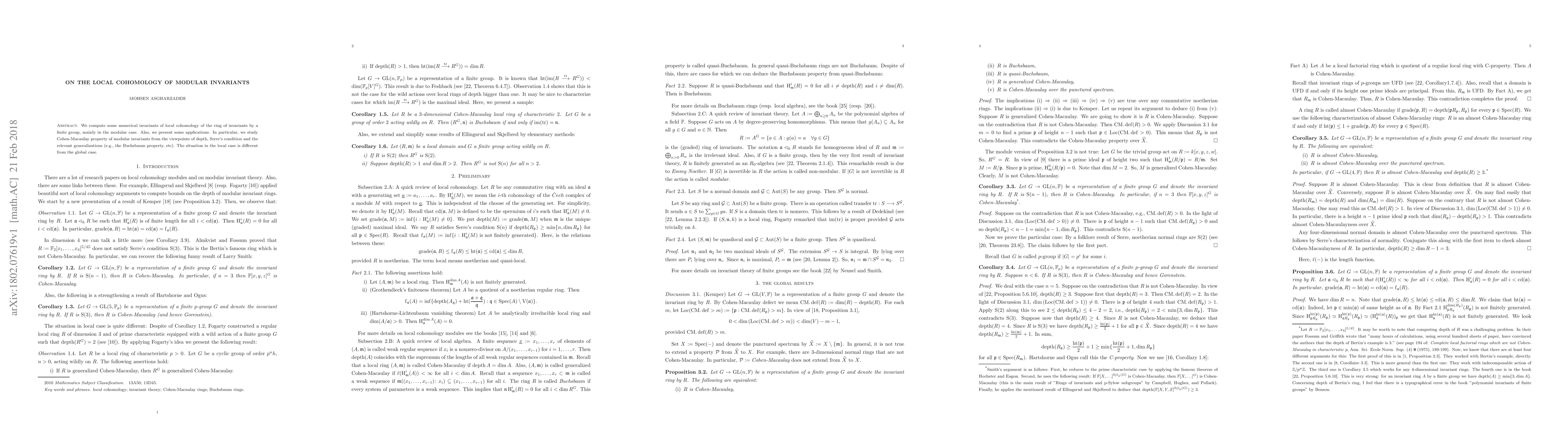 This paper computes numerical invariants of local cohomology for modular invariants under a finite group, focusing on Cohen-Macaulay properties through depth, Serre's conditions, and generalizations like the Buchsbaum property, noting distinct local versus global behaviors.