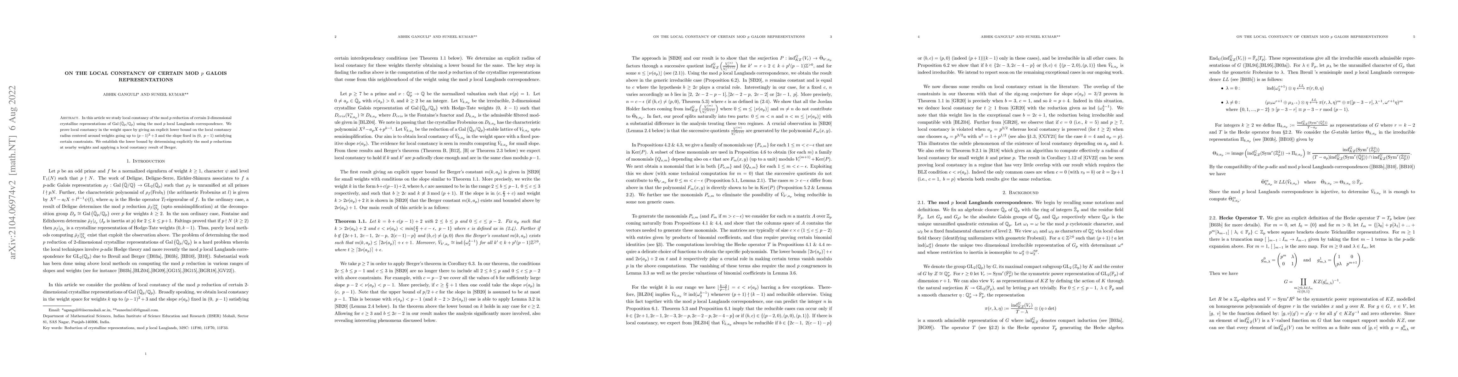 This paper investigates the local constancy of mod $p$ reductions of 2-dimensional crystalline Galois representations, proving it within a specified weight range using the mod $p$ local Langlands correspondence. An explicit lower bound on the local constancy radius is provided, establishing the result through detailed analysis of mod $p$ reductions and application of Berger's local constancy theorem.