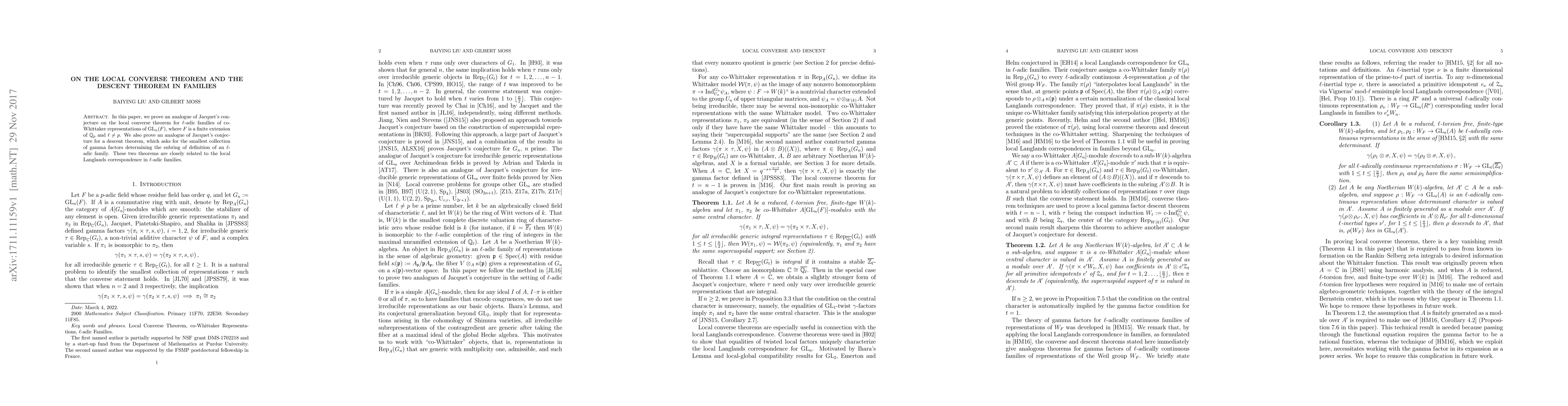 We prove an analogue of Jacquet's conjecture on the local converse theorem for \ell-adic families of co-Whittaker representations of GL_n(F), where F is a finite extension of Q_p and \ell does not equal p. We also prove an analogue of Jacquet's conjecture for a descent theorem, which asks for the smallest collection of gamma factors determining the subring of definition of an \ell-adic family. These two theorems are closely related to the local Langlands correspondence in \ell-adic families.