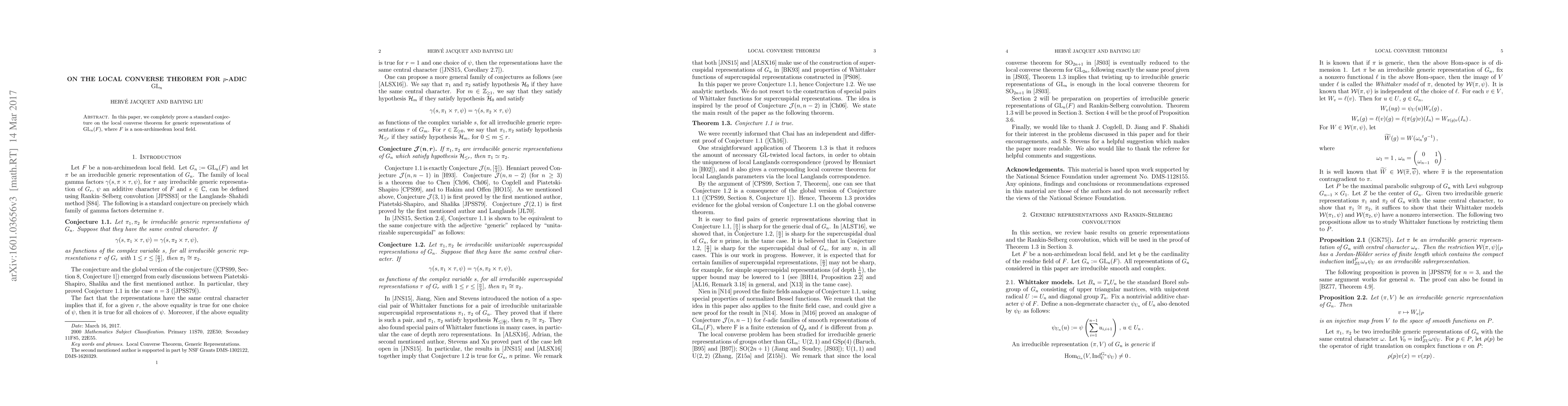 This paper proves a conjecture regarding the local converse theorem for generic representations of the general linear group GLn over a non-archimedean local field F. The result confirms the existence of a correspondence between representations and automorphic forms in this context.