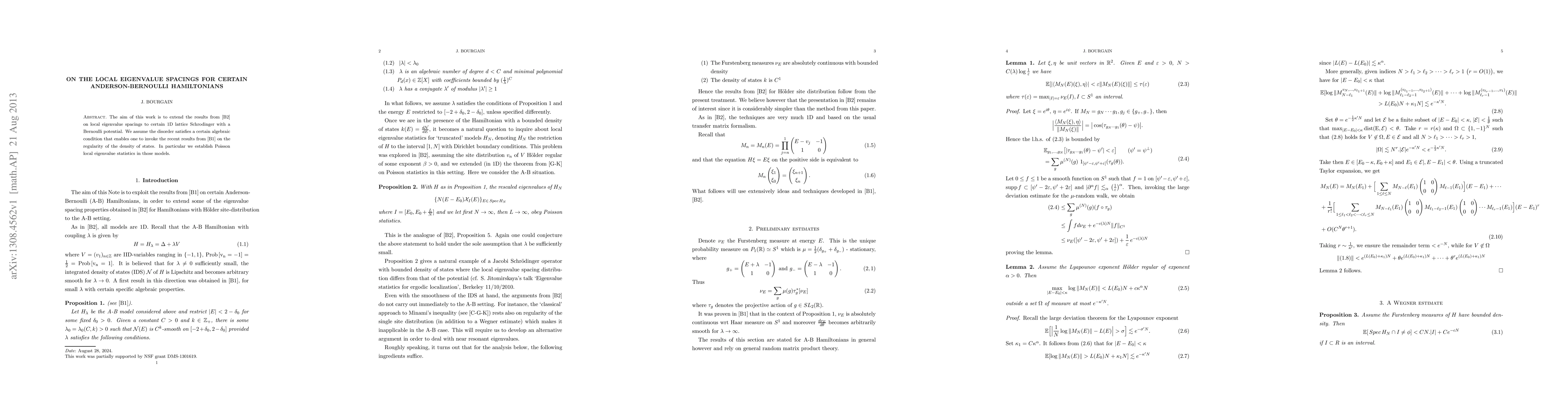 This paper extends findings on local eigenvalue spacings for 1D lattice Schrödinger operators with Bernoulli potentials, assuming a specific algebraic disorder condition. It establishes Poisson statistics for the local eigenvalue distribution, leveraging recent results on the regularity of the density of states.