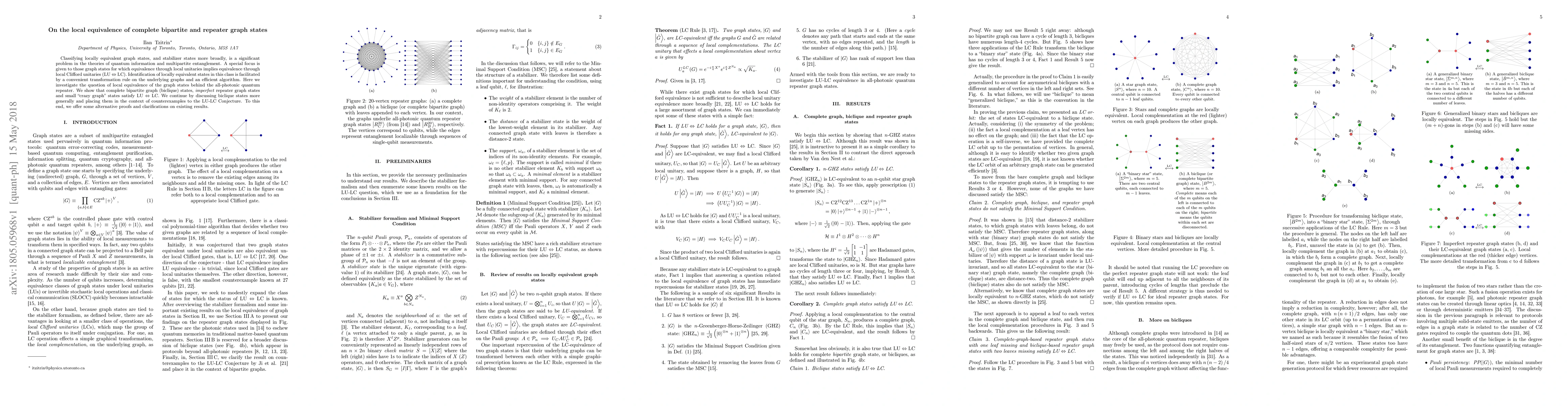 This paper investigates the local equivalence of graph states used in quantum repeaters, showing that complete bipartite, imperfect repeater, and small "crazy graph" states satisfy local unitary equivalence implying local Clifford unitarity equivalence. It also discusses the broader context of biclique states and provides clarifications on related conjectures.