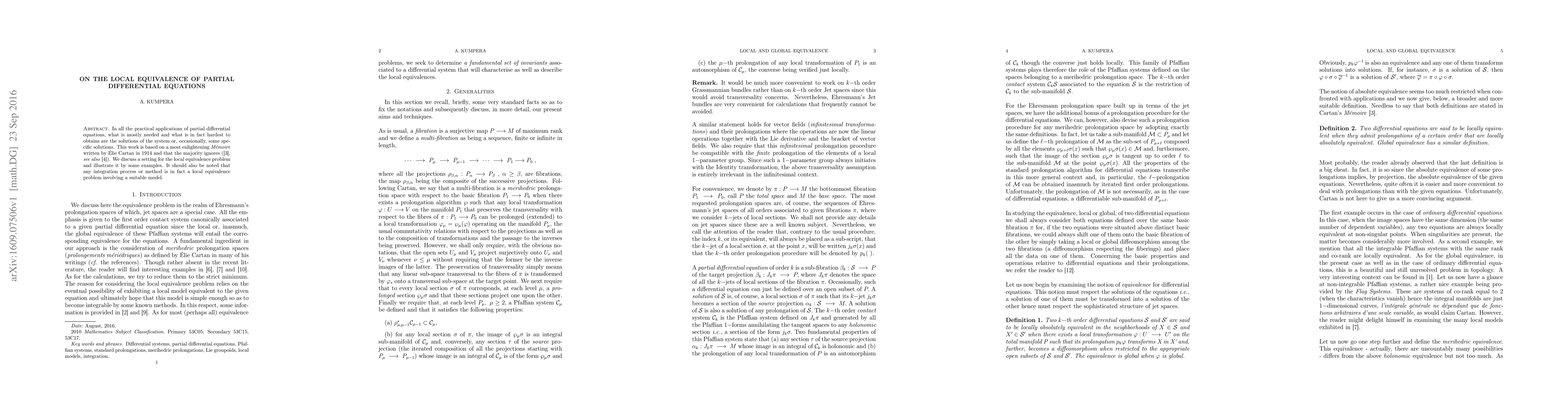 In all the practical applications of partial differential equations, what is mostly needed and what is in fact hardest to obtains are the solutions of the system or, occasionally, some specific solutions. This work is based on a most enlightening M\'emoire written by \'Elie Cartan in 1914 and that the majority ignores. We discuss a setting for the local equivalence problem and illustrate it by some examples. It should also be noted that any integration process or method is in fact a local equivalence problem involving a suitable model.