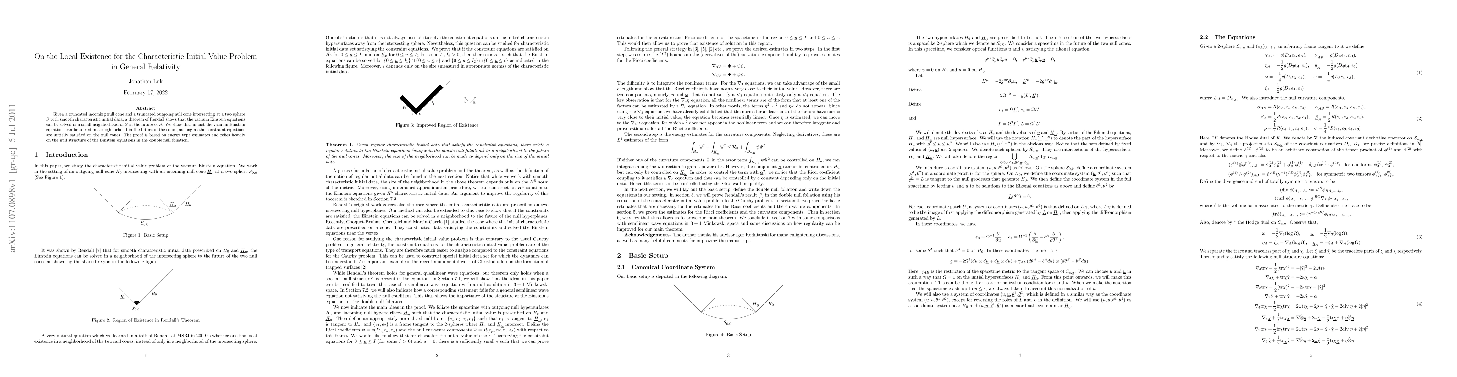 Given a truncated incoming null cone and a truncated outgoing null cone intersecting at a two sphere $S$ with smooth characteristic initial data, a theorem of Rendall shows that the vacuum Einstein equations can be solved in a small neighborhood of $S$ in the future of $S$. We show that in fact the vacuum Einstein equations can be solved in a neighborhood in the future of the cones, as long as the constraint equations are initially satisfied on the null cones. The proof is based on energy type estimates and relies heavily on the null structure of the Einstein equations in the double null foliation.