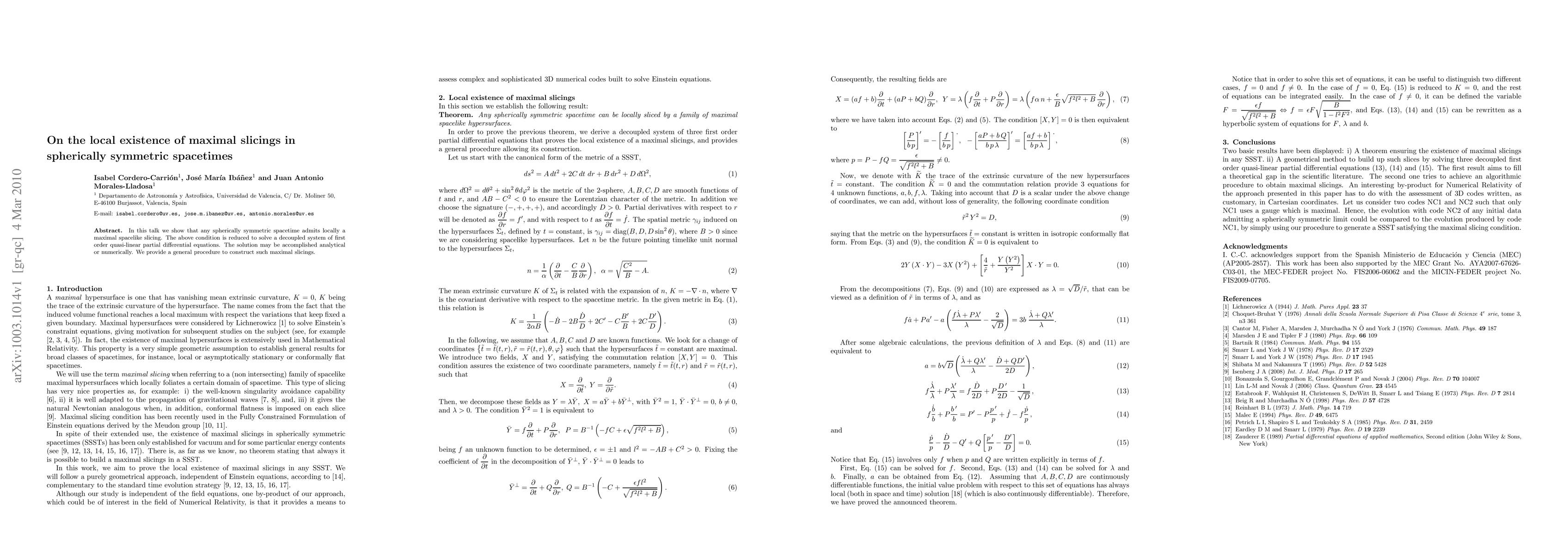 In this talk we show that any spherically symmetric spacetime admits locally a maximal spacelike slicing. The above condition is reduced to solve a decoupled system of first order quasi-linear partial differential equations. The solution may be accomplished analytical or numerically. We provide a general procedure to construct such maximal slicings.