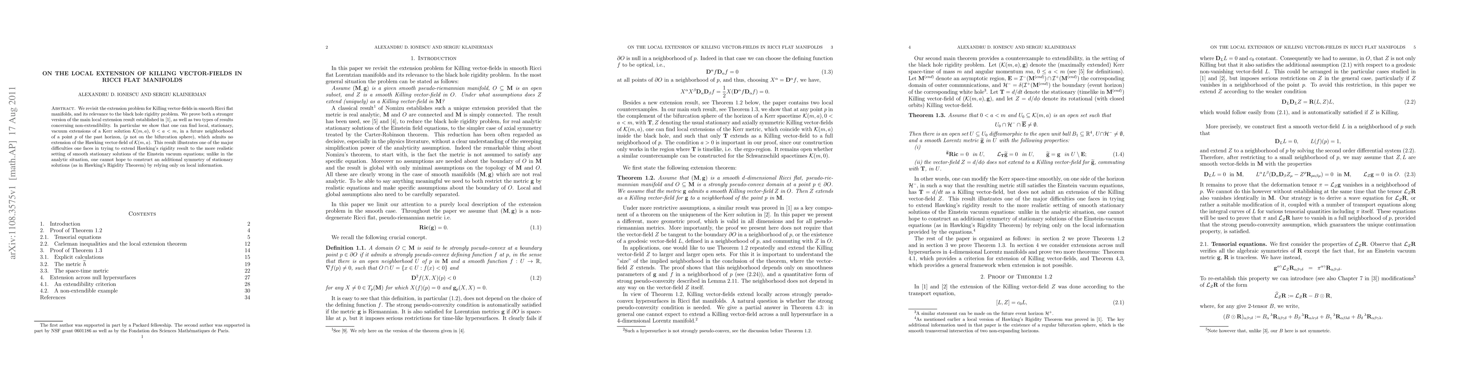 Summary: This paper explores the extension of Killing vector-fields in smooth Ricci flat manifolds, emphasizing its implications for the black hole rigidity problem, which concerns the uniqueness of black hole solutions in general relativity.