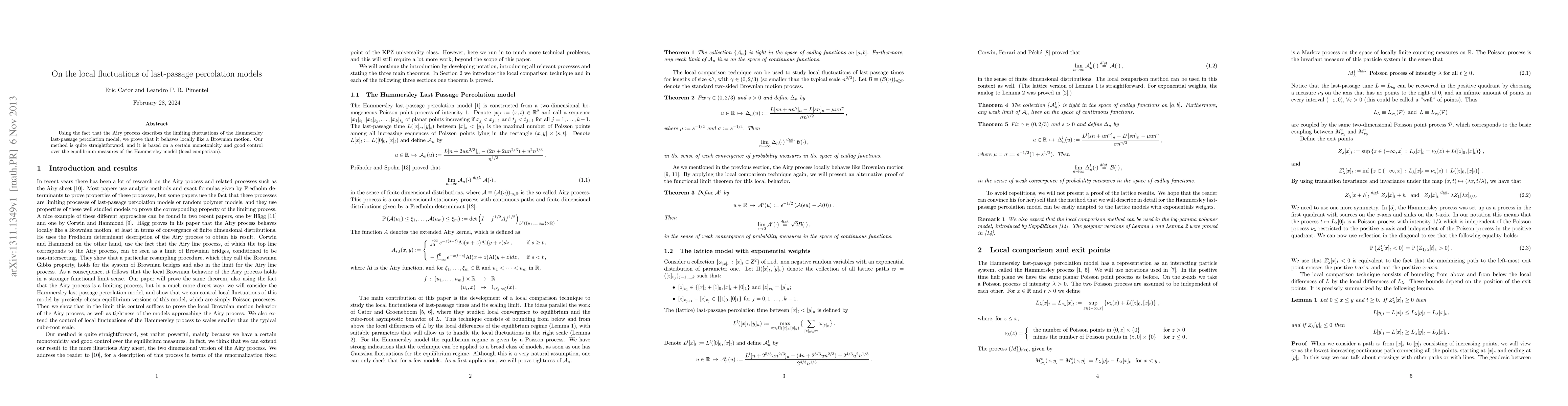This paper demonstrates that the Hammersley last-passage percolation model's local fluctuations resemble those of a Brownian motion, leveraging the Airy process as a limiting description. The authors achieve this through straightforward methods involving monotonicity and precise control over the model's equilibrium measures.