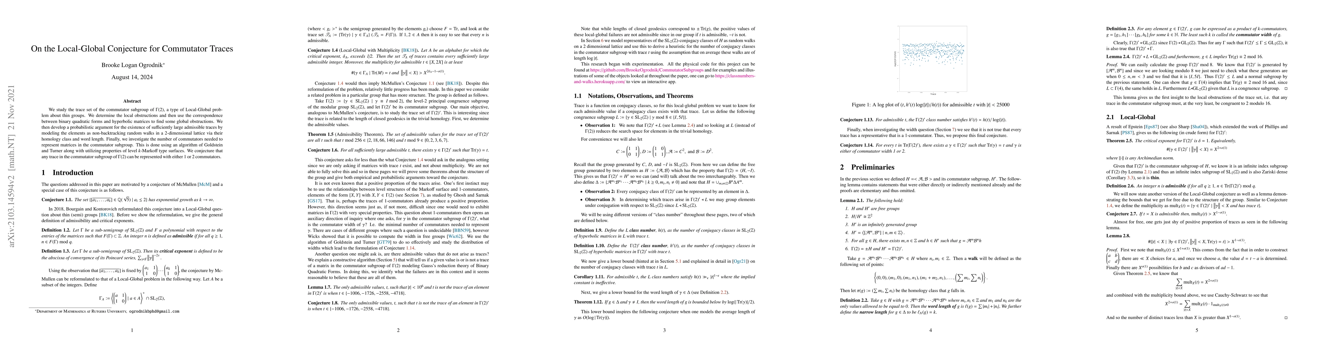 The paper investigates the trace set of the commutator subgroup of $\Gamma(2)$ to address a Local-Global conjecture, identifying local and global obstructions via binary quadratic forms and probabilistic arguments. It conjectures that any trace in the commutator subgroup can be represented by 1 or 2 commutators, explored using an algorithm and properties of level $k$-Markoff surfaces.