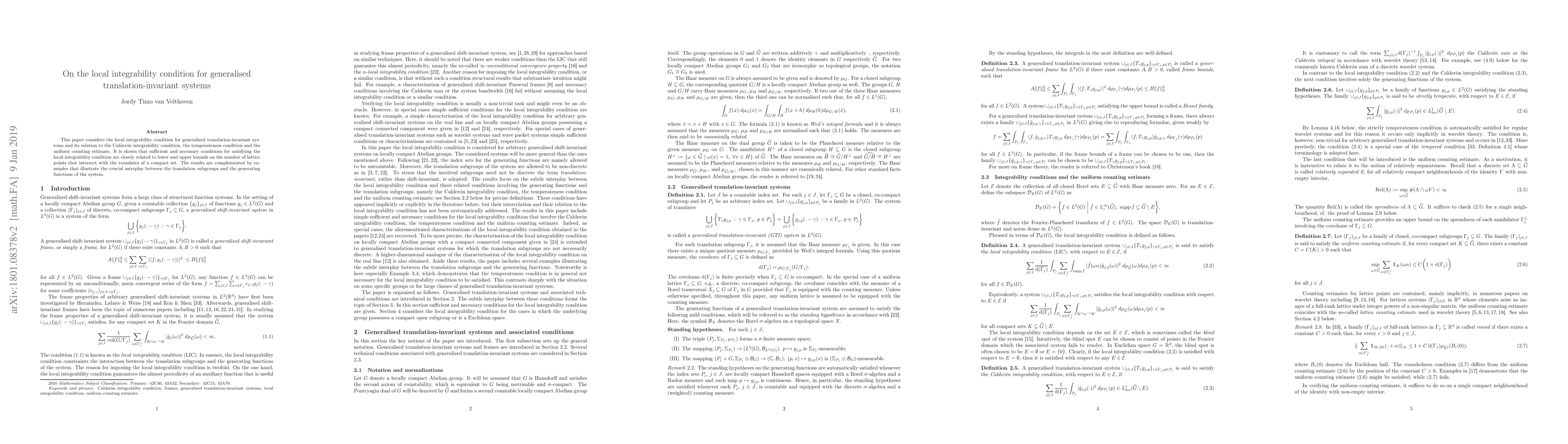 This paper investigates the local integrability condition for generalised translation-invariant systems, demonstrating its connection to the Calder\'on integrability condition and the temperateness condition. It establishes that the local integrability condition is linked to bounds on lattice points intersecting with system translates, supported by examples highlighting the interaction between translation subgroups and system generating functions.