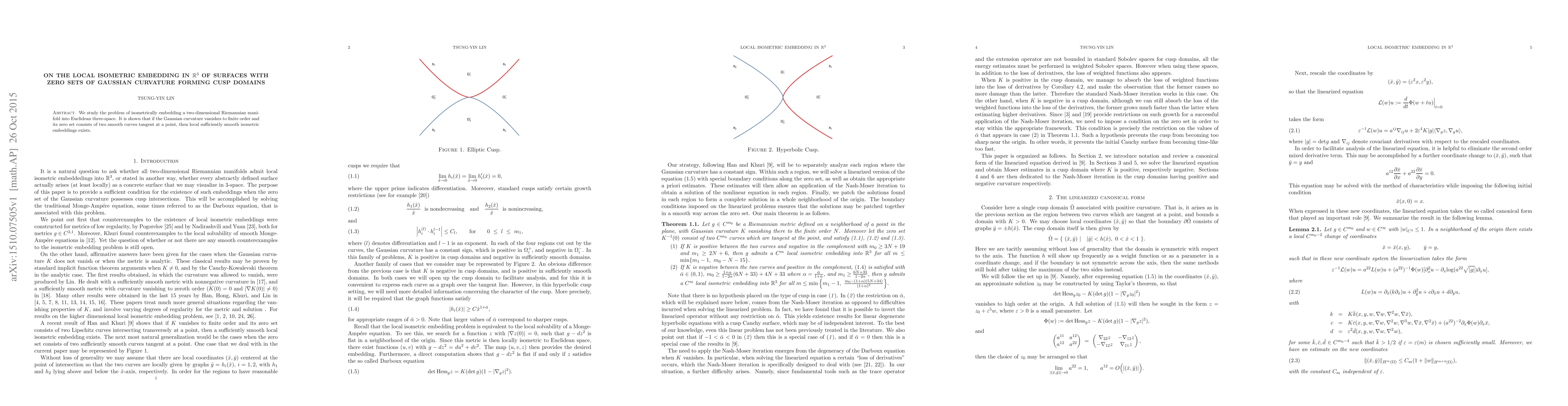 We study the problem of isometrically embedding a two-dimensional Riemannian manifold into Euclidean three-space. It is shown that if Gaussian curvature vanishes to finite order and its zero set consists of two smooth curves tangent at a point, then local sufficiently smooth isometric embedding exists.