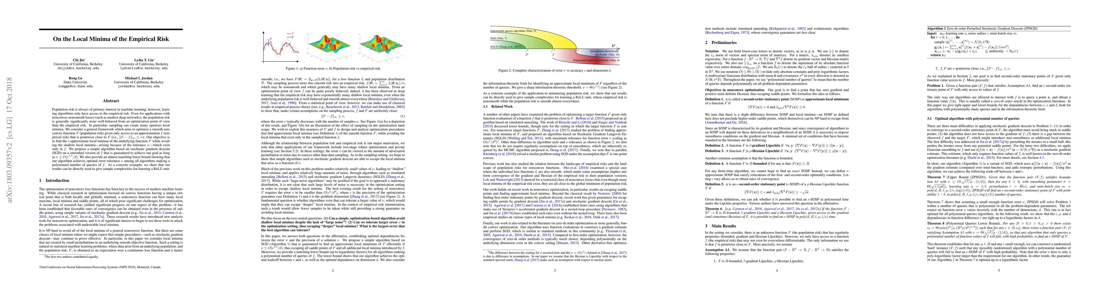 Population risk is always of primary interest in machine learning; however, learning algorithms only have access to the empirical risk. Even for applications with nonconvex nonsmooth losses (such as modern deep networks), the population risk is generally significantly more well-behaved from an optimization point of view than the empirical risk. In particular, sampling can create many spurious local minima. We consider a general framework which aims to optimize a smooth nonconvex function $F$ (population risk) given only access to an approximation $f$ (empirical risk) that is pointwise close to $F$ (i.e., $\|F-f\|_{\infty} \le \nu$). Our objective is to find the $\epsilon$-approximate local minima of the underlying function $F$ while avoiding the shallow local minima---arising because of the tolerance $\nu$---which exist only in $f$. We propose a simple algorithm based on stochastic gradient descent (SGD) on a smoothed version of $f$ that is guaranteed to achieve our goal as long as $\nu \le O(\epsilon^{1.5}/d)$. We also provide an almost matching lower bound showing that our algorithm achieves optimal error tolerance $\nu$ among all algorithms making a polynomial number of queries of $f$. As a concrete example, we show that our results can be directly used to give sample complexities for learning a ReLU unit.