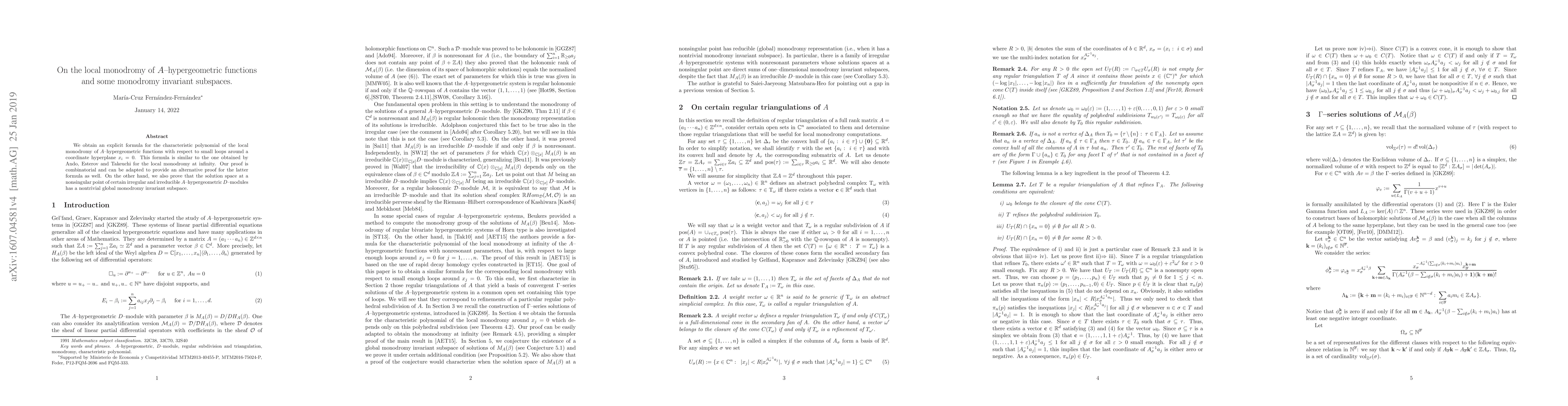 We obtain an explicit formula for the characteristic polynomial of the local monodromy of $A$-hypergeometric functions with respect to small loops around a coordinate hyperplane $x_i =0$. This formula is similar to the one obtained by Ando, Esterov and Takeuchi for the local monodromy at infinity. Our proof is combinatorial and can be adapted to provide an alternative proof for the latter formula as well. On the other hand, we also prove that the solution space at a nonsingular point of certain irregular and irreducible $A$--hypergeometric $D$--modules has a nontrivial global monodromy invariant subspace.