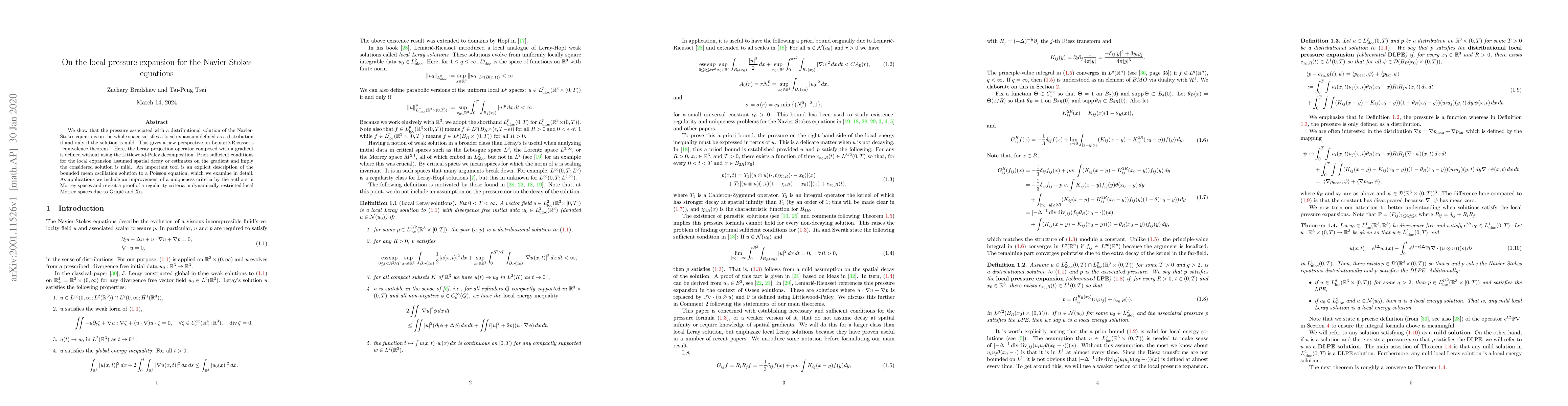 We show that the pressure associated with a distributional solution of the Navier-Stokes equations on the whole space satisfies a local expansion defined as a distribution if and only if the solution is mild. This gives a new perspective on Lemari\'e-Rieusset's "equivalence theorem." Here, the Leray projection operator composed with a gradient is defined without using the Littlewood-Paley decomposition. Prior sufficient conditions for the local expansion assumed spatial decay or estimates on the gradient and imply the considered solution is mild. An important tool is an explicit description of the bounded mean oscillation solution to a Poisson equation, which we examine in detail. As applications we include an improvement of a uniqueness criteria by the authors in Morrey spaces and revisit a proof of a regularity criteria in dynamically restricted local Morrey spaces due to Gruji\'c and Xu.
