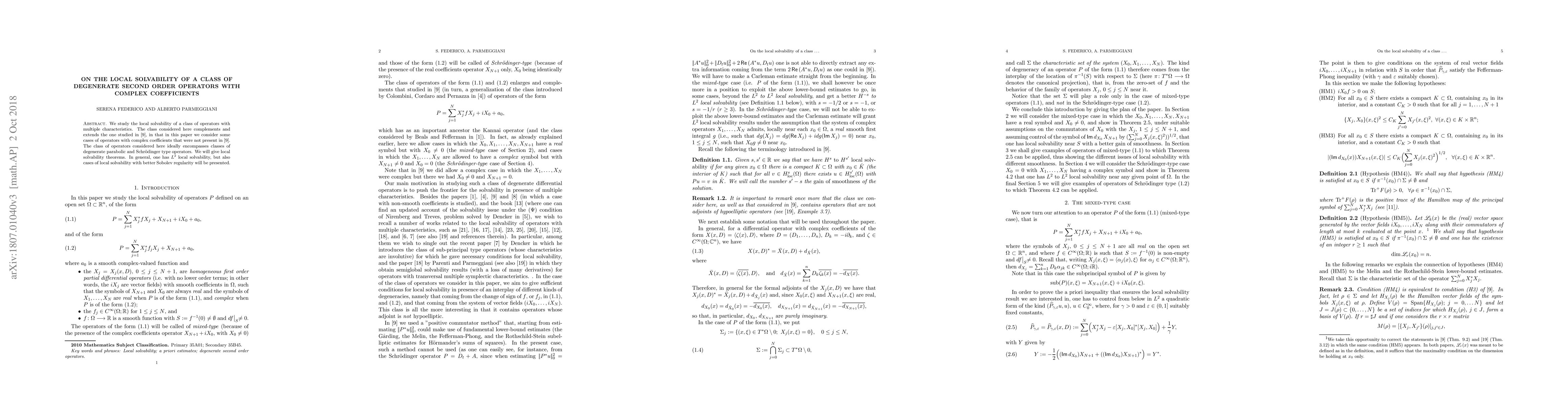 We study the local solvability of a class of operators with multiple characteristics. The class considered here complements and extends the one studied in [9], in that in this paper we consider some cases of operators with complex coefficients that were not present in [9]. The class of operators considered here ideally encompasses classes of degenerate parabolic and Schr\"odinger type operators. We will give local solvability theorems. In general, one has $L^2$ local solvability, but also cases of local solvability with better Sobolev regularity will be presented.