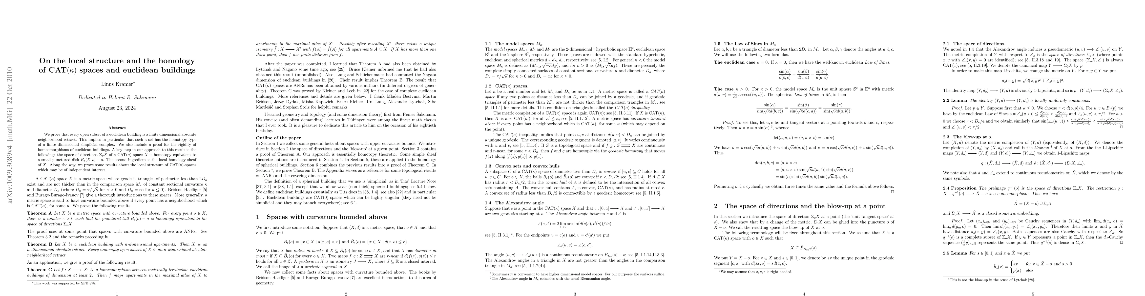We prove that every open subset of a euclidean building is a finite dimensional absolute neighborhood retract. This implies in particular that such a set has the homotopy type of a finite dimensional simplicial complex. We also include a proof for the rigidity of homeomorphisms of euclidean buildings. A key step in our approach to this result is the following: the space of directions $\Sigma_oX$ of a CAT$(\kappa)$ space $X$ is homotopy quivalent to a small punctured disk $B_\eps(X,o)\setminus o$. The second ingredient is the local homology sheaf of $X$. Along the way, we prove some results about the local structure of CAT$(\kappa)$-spaces which may be of independent interest.