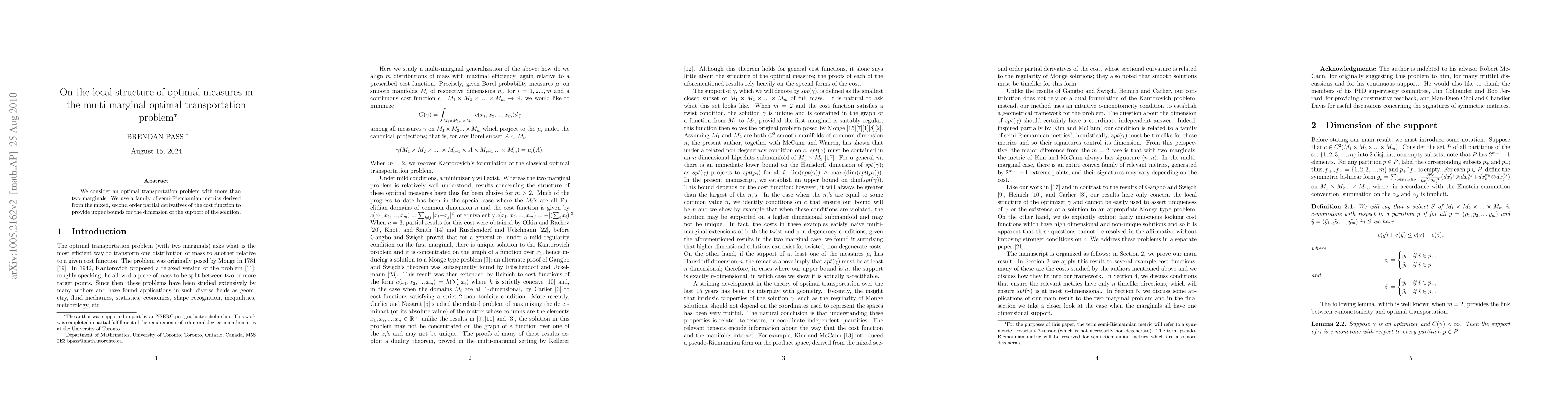 Summary: This paper investigates the multi-marginal optimal transportation problem, employing semi-Riemannian metrics derived from the mixed second-order partial derivatives of the cost function to establish upper bounds for the dimension of the support of the optimal measure.