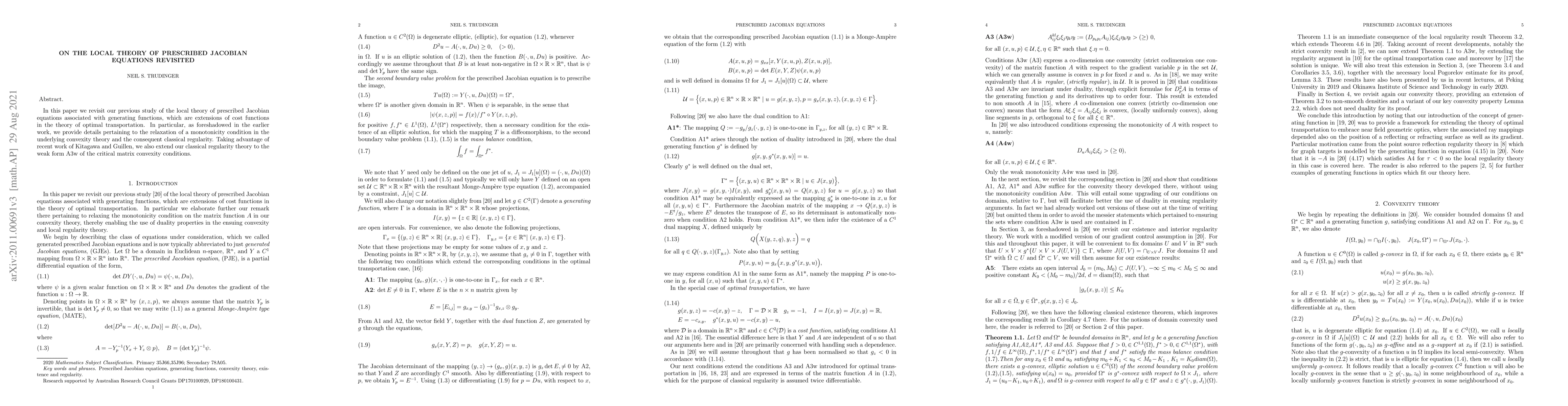 In this paper we revisit our previous study of the local theory of prescribed Jacobian equations associated with generating functions, which are extensions of cost functions in the theory of optimal transportation. In particular, as foreshadowed in the earlier work, we provide details pertaining to the relaxation of a monotonicity condition A4w in the underlying convexity theory and the consequent classical regularity. Taking advantage of recent work of Kitagawa and Guillen, we also extend our classical regularity theory to the weak form A3w of the critical matrix convexity conditions.