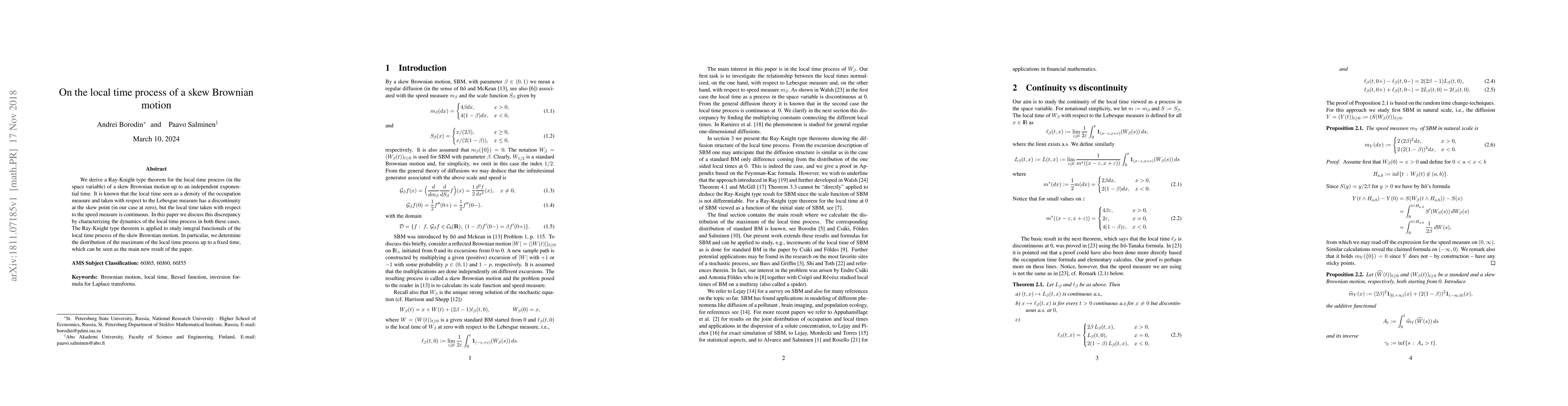 This paper derives a Ray-Knight type theorem for the local time process of skew Brownian motion, focusing on the discontinuity in local time relative to the Lebesgue measure versus continuity relative to the speed measure. The main result is the distribution of the maximum local time up to a fixed time.