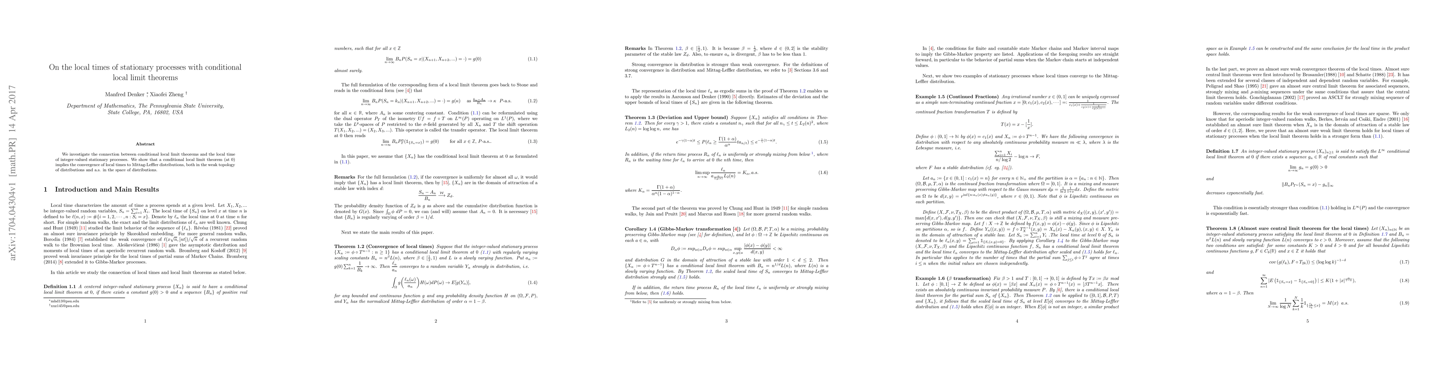 This research explores the relationship between conditional local limit theorems and local times of integer-valued stationary processes, demonstrating that a conditional local limit theorem at 0 implies convergence of local times to Mittag-Leffler distributions, both in weak topology of distributions and almost surely in the space of distributions.
