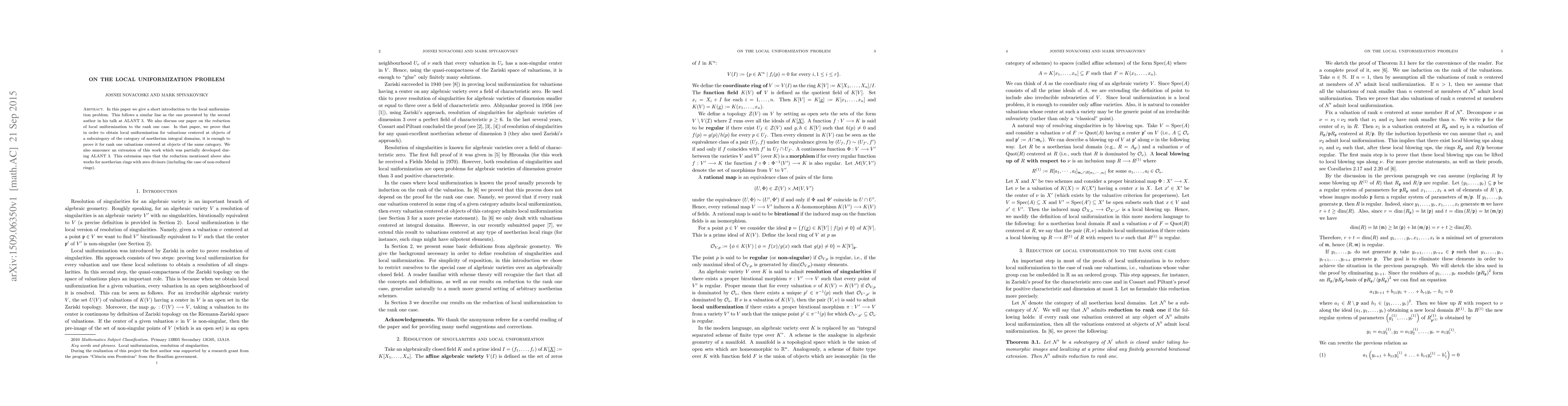 This paper introduces the local uniformization problem and discusses its reduction to the rank one case, proving that local uniformization for a subcategory of noetherian integral domains can be achieved by proving it for rank one valuations. An extension of this work, partially developed during ALANT 3, extends the reduction to noetherian rings with zero divisors, including non-reduced rings.
