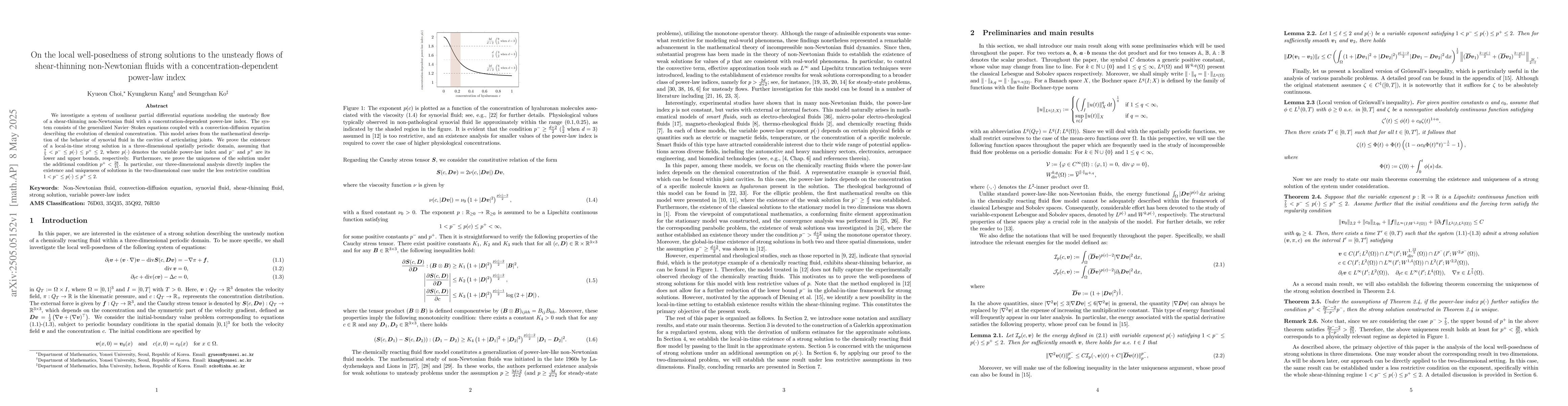 Researchers prove the existence of strong solutions to a model for unsteady flows of shear-thinning non-Newtonian fluids with a concentration-dependent power-law index, under specific bounds on the variable power-law index.