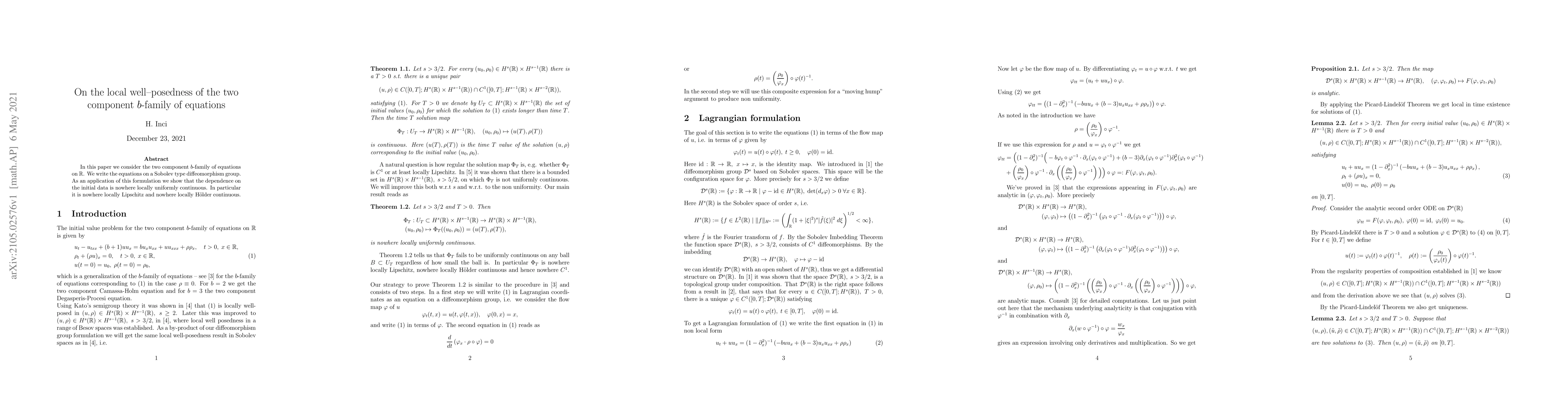 In this paper we consider the two component $b$-family of equations on $\mathbb R$. We write the equations on a Sobolev type diffeomorphism group. As an application of this formulation we show that the dependence on the initial data is nowhere locally uniformly continuous. In particular it is nowhere locally Lipschitz and nowhere locally H\"older continuous.