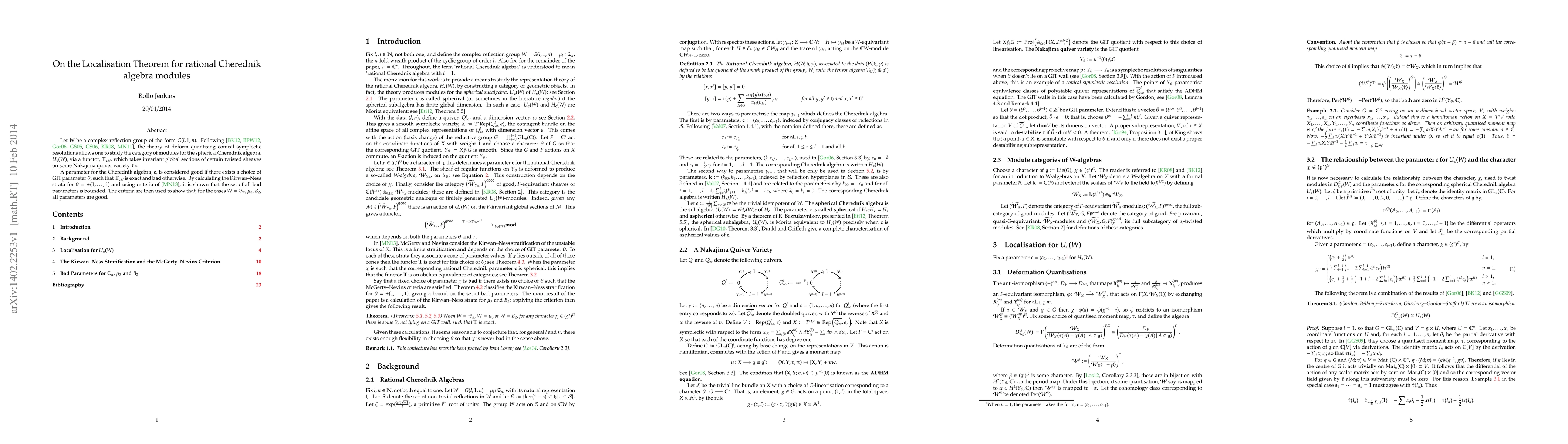 Let $W$ be a complex reflection group of the form $G(l,1,n)$. Following [BK12, BPW12, Gor06, GS05, GS06, KR08, MN11], the theory of deform quantising conical symplectic resolutions allows one to study the category of modules for the spherical Cherednik algebra, $U_\textbf{c}(W)$, via a functor, $\mathbb T_{\textbf{c},\theta}$, which takes invariant global sections of certain twisted sheaves on some Nakajima quiver variety $Y_\theta$. A parameter for the Cherednik algebra, $\textbf{c}$, is considered `good' if there exists a choice of GIT parameter $\theta$, such that $\mathbb T_{\textbf{c},\theta}$ is exact and `bad' otherwise. By calculating the Kirwan--Ness strata for $\theta=\pm(1,\ldots,1)$ and using criteria of [MN13], it is shown that the set of all bad parameters is bounded. The criteria are then used to show that, for the cases $W=\mathfrak S_n, \mu_3, B_2$, all parameters are good.