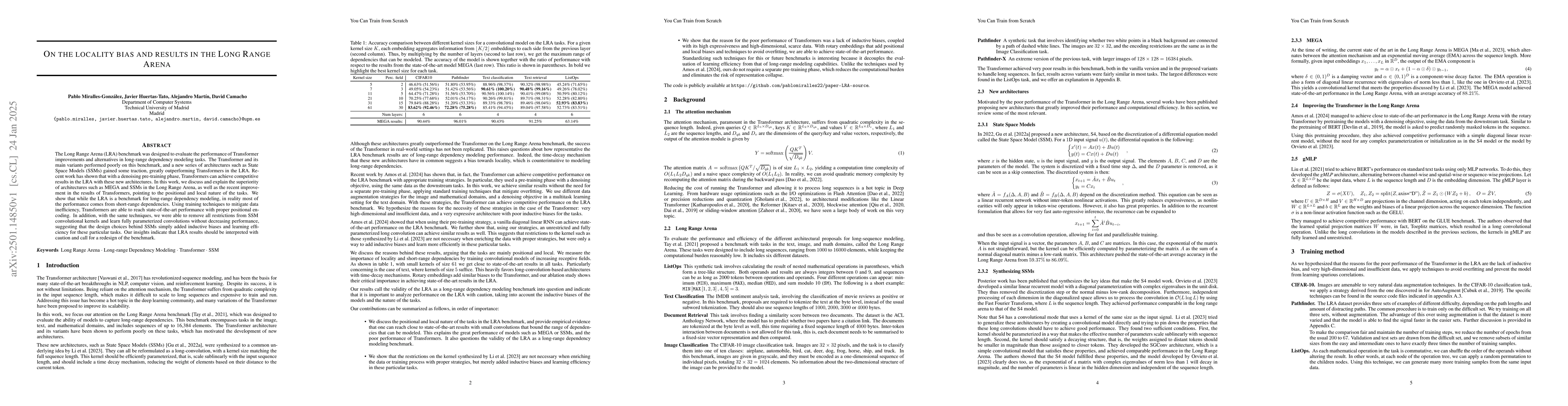 The Long Range Arena (LRA) benchmark was designed to evaluate the performance of Transformer improvements and alternatives in long-range dependency modeling tasks. The Transformer and its main variants performed poorly on this benchmark, and a new series of architectures such as State Space Models (SSMs) gained some traction, greatly outperforming Transformers in the LRA. Recent work has shown that with a denoising pre-training phase, Transformers can achieve competitive results in the LRA with these new architectures. In this work, we discuss and explain the superiority of architectures such as MEGA and SSMs in the Long Range Arena, as well as the recent improvement in the results of Transformers, pointing to the positional and local nature of the tasks. We show that while the LRA is a benchmark for long-range dependency modeling, in reality most of the performance comes from short-range dependencies. Using training techniques to mitigate data inefficiency, Transformers are able to reach state-of-the-art performance with proper positional encoding. In addition, with the same techniques, we were able to remove all restrictions from SSM convolutional kernels and learn fully parameterized convolutions without decreasing performance, suggesting that the design choices behind SSMs simply added inductive biases and learning efficiency for these particular tasks. Our insights indicate that LRA results should be interpreted with caution and call for a redesign of the benchmark.