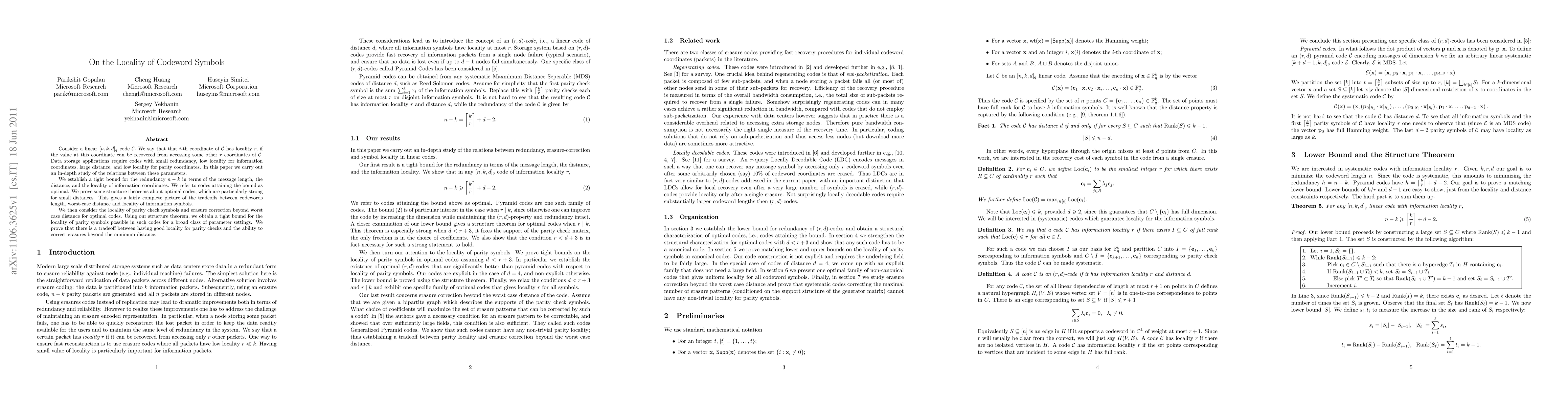 This paper investigates the relationship between code parameters in linear codes, focusing on the locality of both information and parity coordinates. It establishes tight bounds for redundancy and proves structure theorems for optimal codes, particularly for small distances, elucidating the trade-offs between code length, distance, and locality. It also explores the locality of parity symbols and their role in erasure correction beyond worst-case distance.