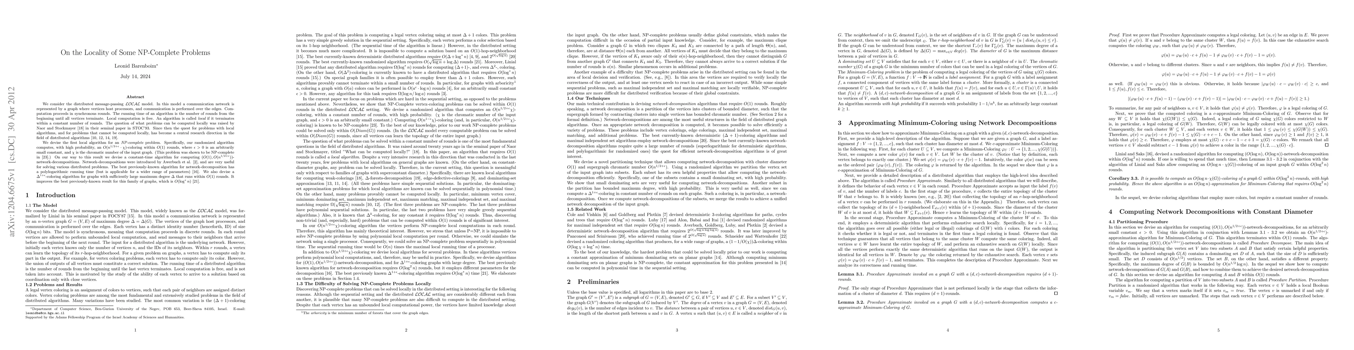 We consider the distributed message-passing {LOCAL} model. In this model a communication network is represented by a graph where vertices host processors, and communication is performed over the edges. Computation proceeds in synchronous rounds. The running time of an algorithm is the number of rounds from the beginning until all vertices terminate. Local computation is free. An algorithm is called {local} if it terminates within a constant number of rounds. The question of what problems can be computed locally was raised by Naor and Stockmayer \cite{NS93} in their seminal paper in STOC'93. Since then the quest for problems with local algorithms, and for problems that cannot be computed locally, has become a central research direction in the field of distributed algorithms \cite{KMW04,KMW10,LOW08,PR01}. We devise the first local algorithm for an {NP-complete} problem. Specifically, our randomized algorithm computes, with high probability, an O(n^{1/2 + epsilon} \cdot chi)-coloring within O(1) rounds, where epsilon > 0 is an arbitrarily small constant, and chi is the chromatic number of the input graph. (This problem was shown to be NP-complete in \cite{Z07}.) On our way to this result we devise a constant-time algorithm for computing (O(1), O(n^{1/2 + epsilon}))-network-decompositions. Network-decompositions were introduced by Awerbuch et al. \cite{AGLP89}, and are very useful for solving various distributed problems. The best previously-known algorithm for network-decomposition has a polylogarithmic running time (but is applicable for a wider range of parameters) \cite{LS93}. We also devise a Delta^{1 + epsilon}-coloring algorithm for graphs with sufficiently large maximum degree Delta that runs within O(1) rounds. It improves the best previously-known result for this family of graphs, which is O(\log-star n) \cite{SW10}.