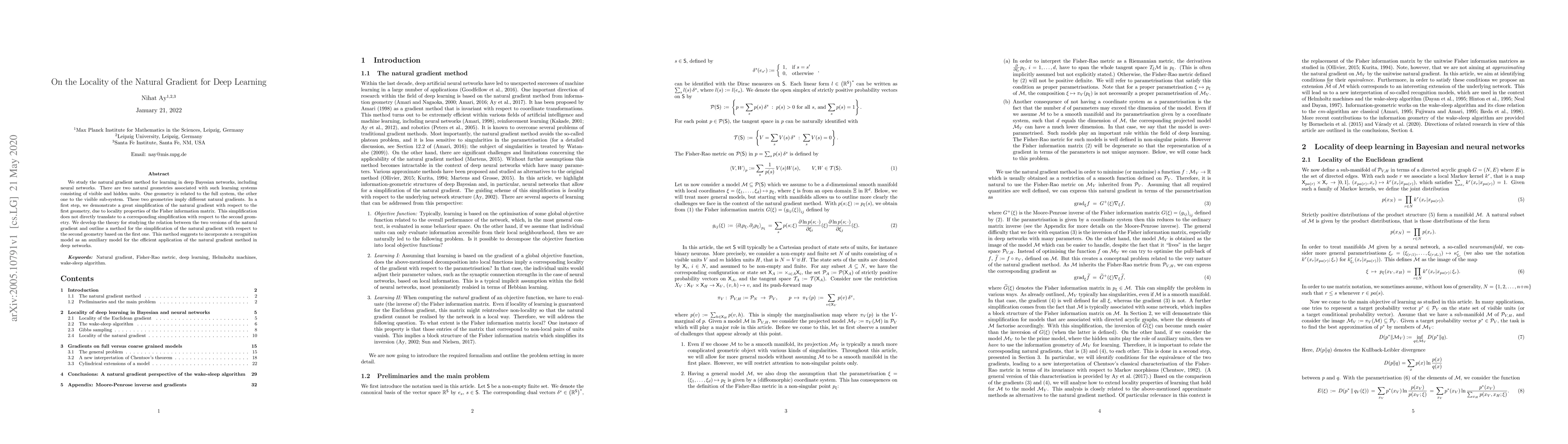 This paper explores the natural gradient method in deep Bayesian networks, highlighting the locality properties of the Fisher information matrix that simplify the gradient with respect to the full system geometry. It develops a theoretical framework to relate and simplify the natural gradient concerning the visible sub-system geometry, proposing the use of a recognition model as an auxiliary tool for efficient gradient application.